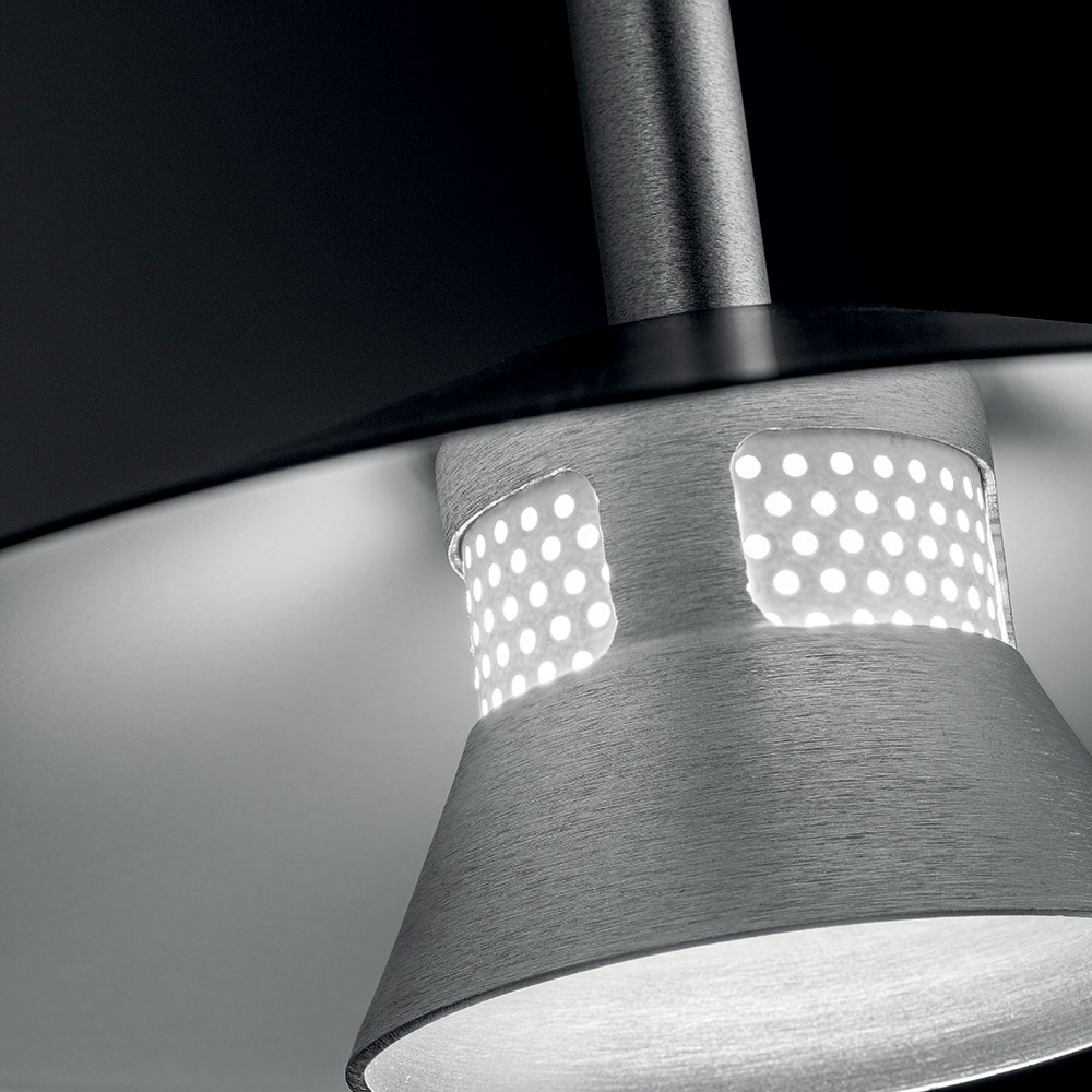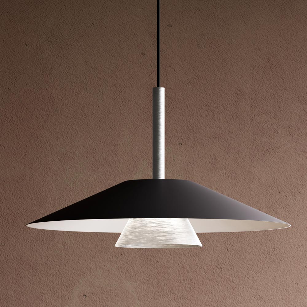 Deze lamp is een perfecte combinatie van eigentijds design en industriële elegantie , ontworpen voor wie houdt van verfijnde details en een gedurfde esthetiek. De geometrische structuur, met een conische diffuser en een grote reflecterende schijf, creëert een fascinerend spel van volumes en contrasten , wat zorgt voor een gericht en omhullend licht.
