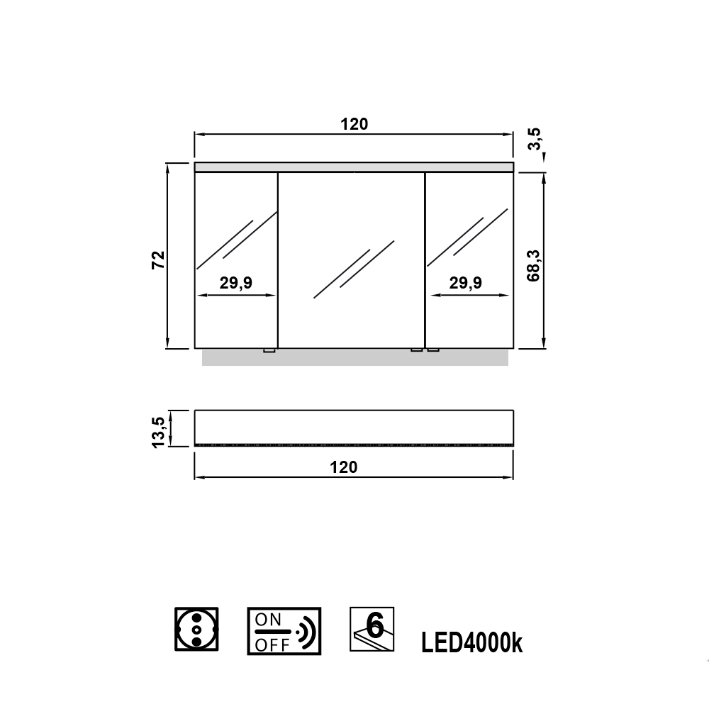 Kast met 3 spiegeldeuren. Een dunne lijn van licht kenmerkt het profiel van dit kabinet om een perfecte frontale verlichting bieden. Geïntegreerd in de topstructuur en de onderkant van de volledige omgevingslicht de lichtopbrengst van deze spiegel bestuurd door een sensor. Gemakkelijke het openen van de deuren door een chroomstaal handgreep. Structuur FENIX, polymeer materiaal met nano technologische behandeling, waterafstotend, anti-fingerprint en zacht aanvoelt. Geleverd met socket en schakelaar.