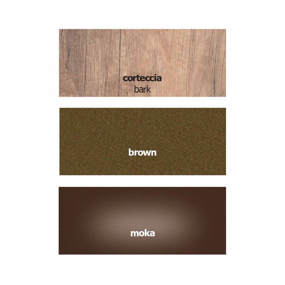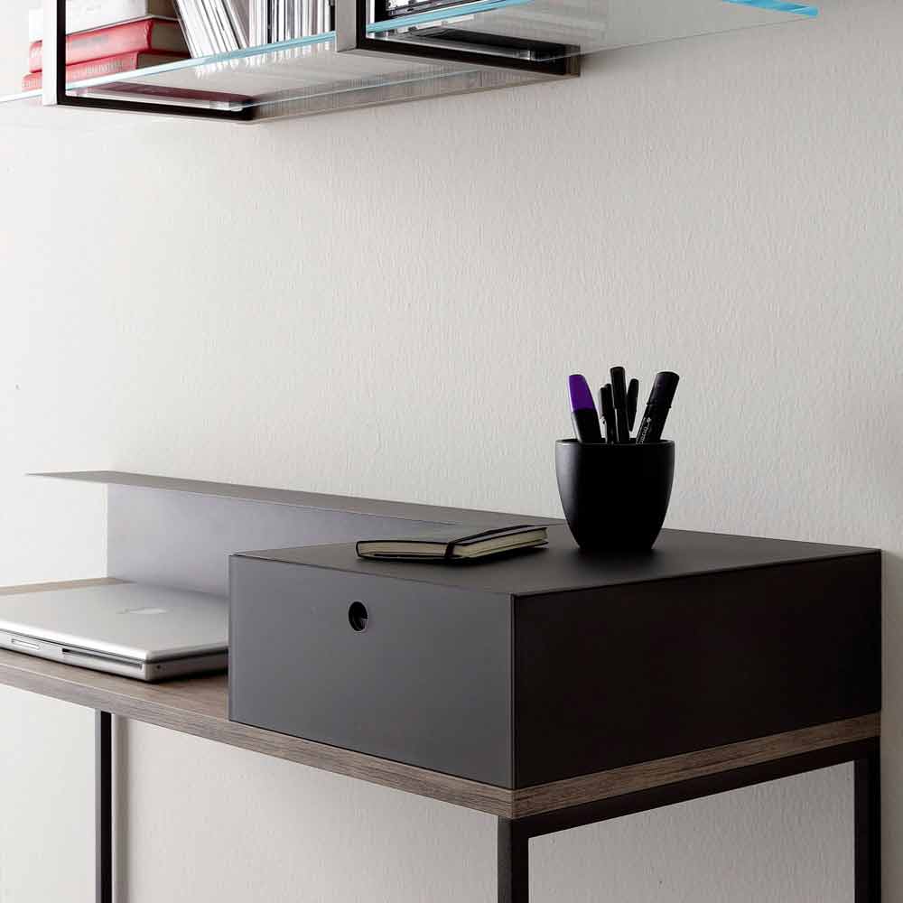 Modern en elegant bureau gemaakt in Italië met melamine blad in schorsafwerking en structuur in bruin geverfd metaal . Het is ook compleet met een praktische lade bedekt met kristal en boven het blad geplaatst en een metalen achterwand die bij de basis past. Deze twee elementen verrijken het ontwerp van het product door een sterke functionele component te geven. De verfijnde esthetiek en majesteit van hout worden gecombineerd met de moderne toets van geverfd metaal en de tijdloze elegantie van kristal om een uniek en exclusief meubelstuk te creëren, ideaal om de functionaliteit van een bureau te combineren met het ontwerp van een decoratief element dat vernieuwend kan worden de stijl van de omgeving.