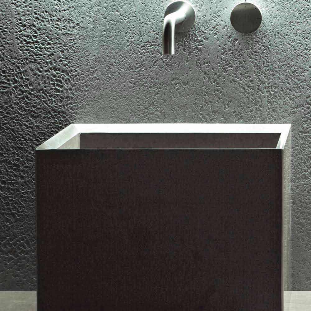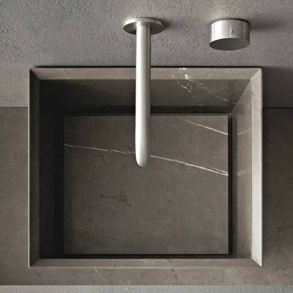 Vierkant opzetwastafel, modern design in natuursteen, met verborgen afvoer.