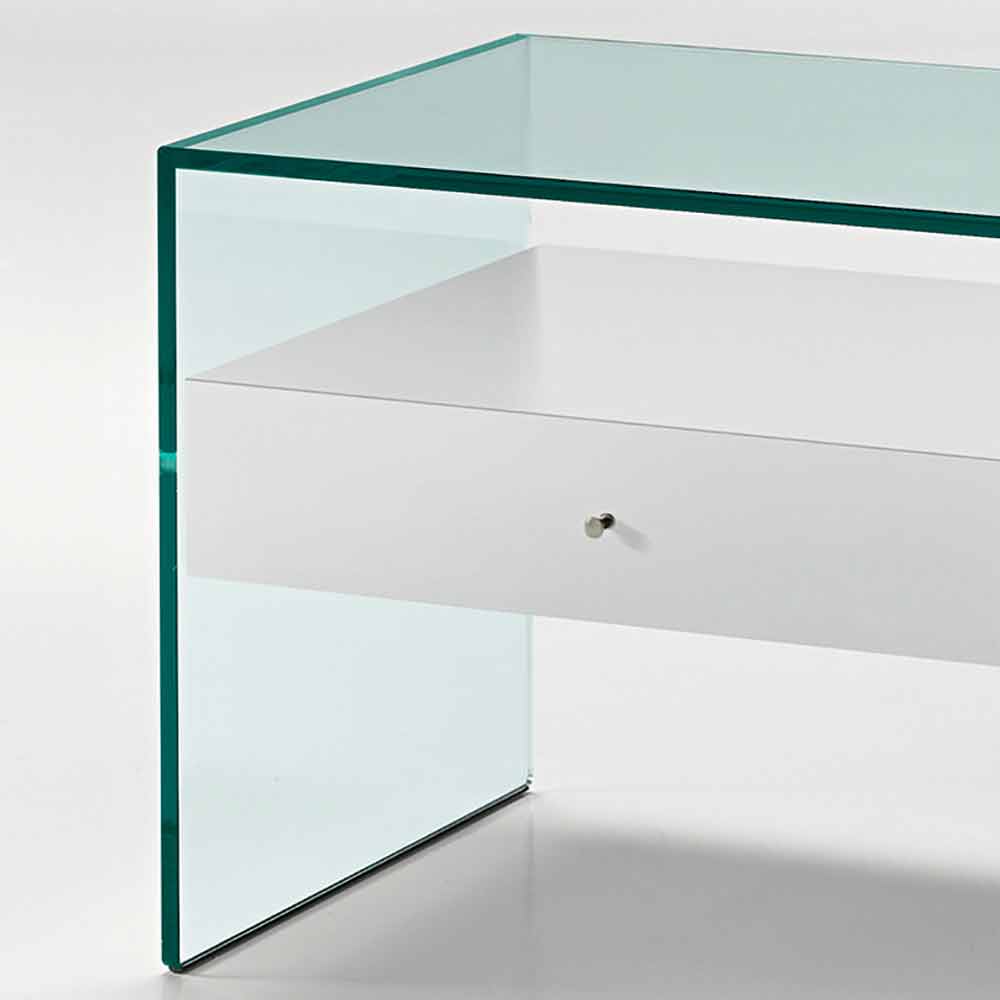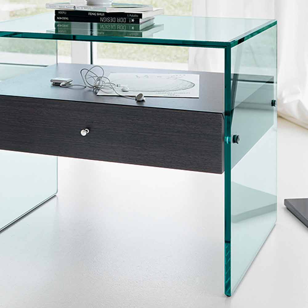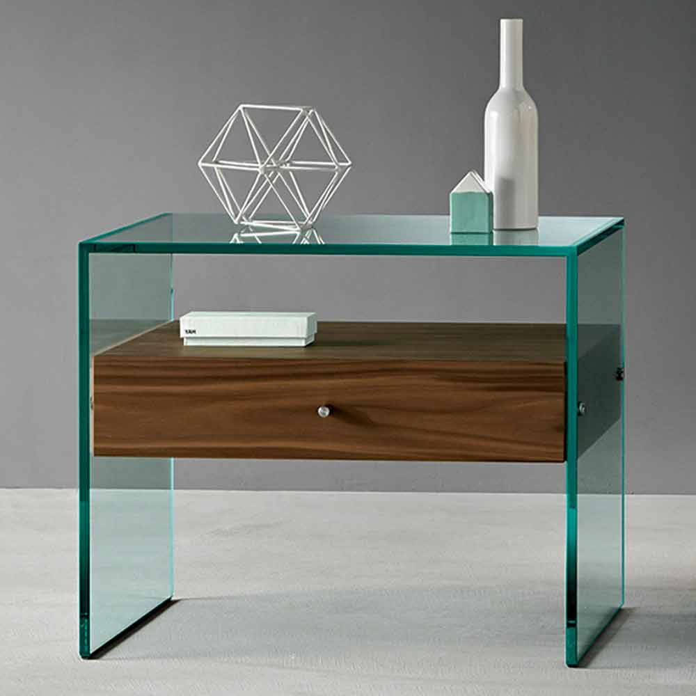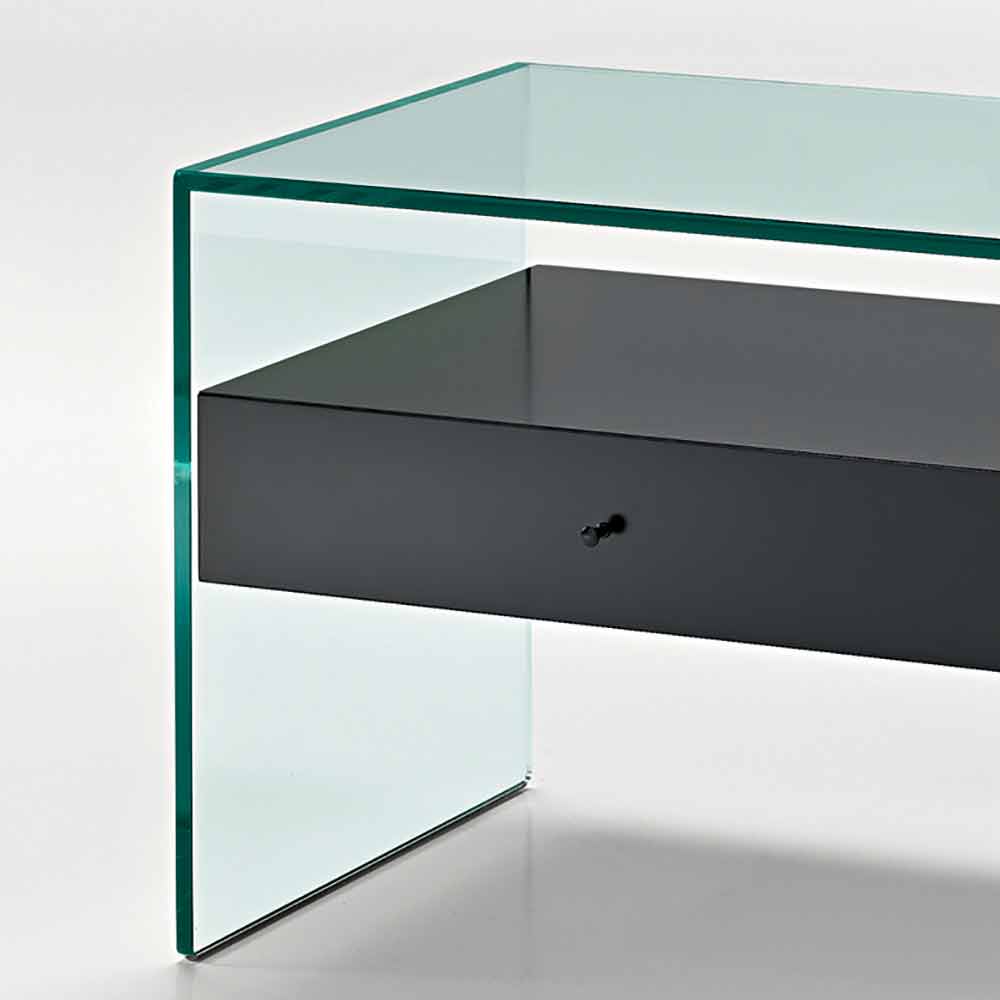 Modern design bijzettafel in extrahelder glas met houten lade, met de hand gerealiseerd in Italië.