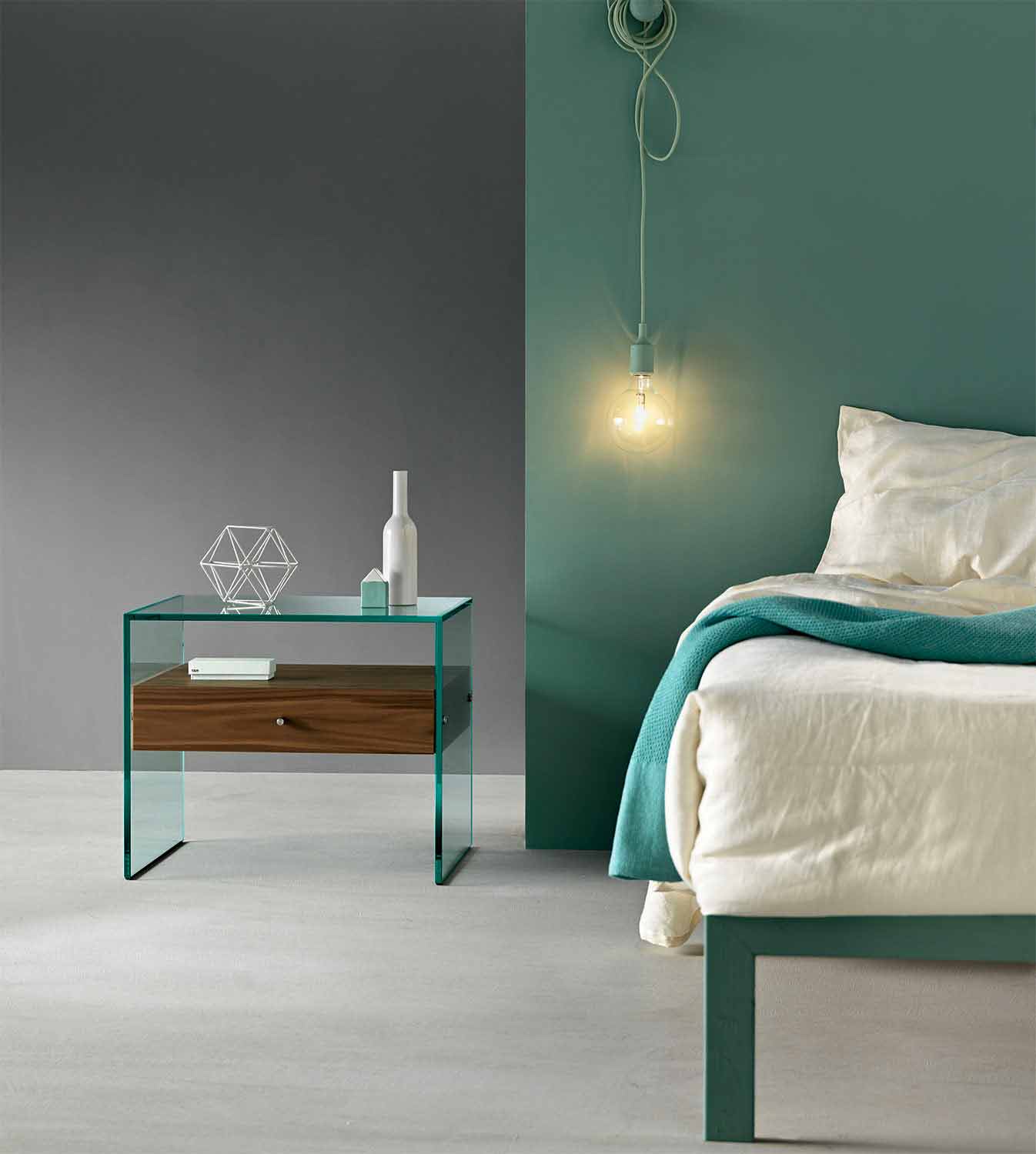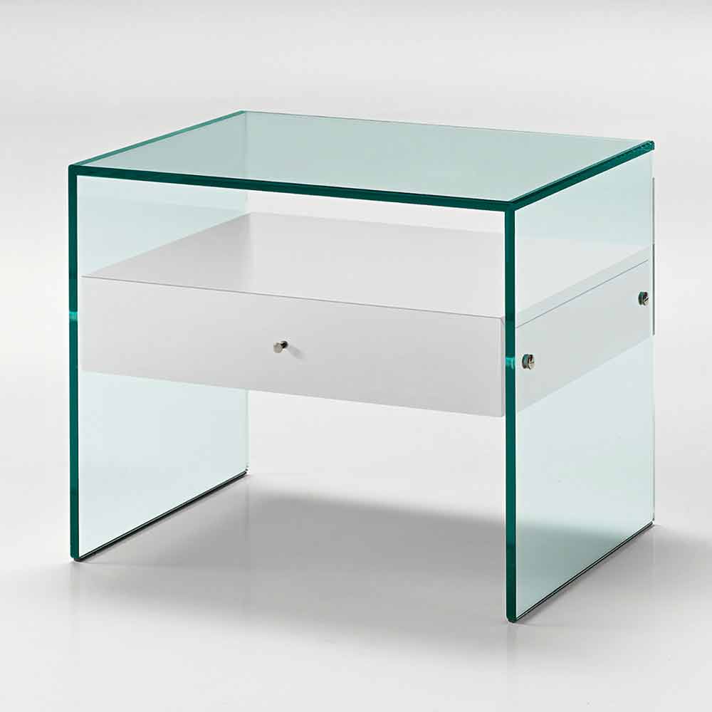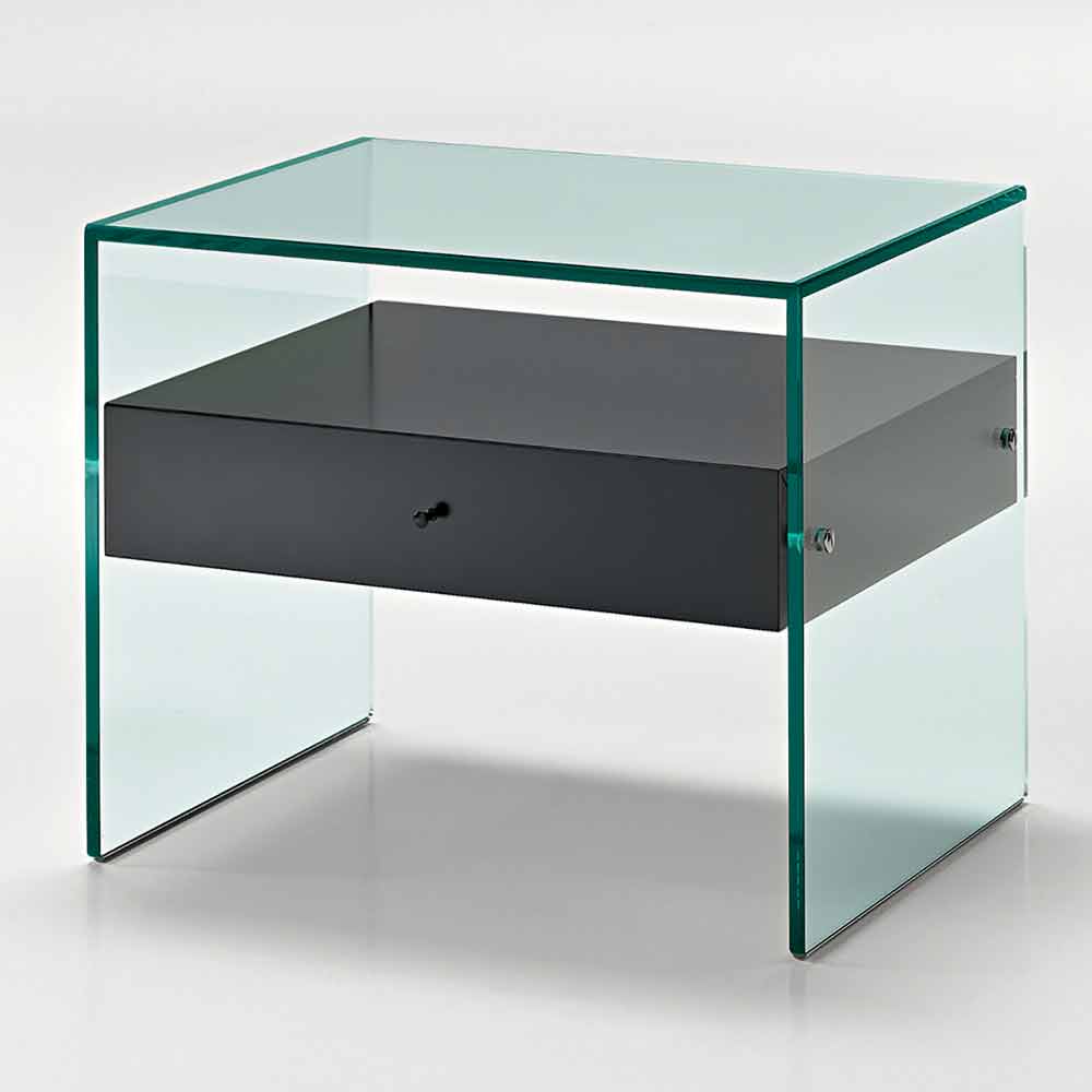 Modern design bijzettafel in extrahelder glas met houten lade, met de hand gerealiseerd in Italië.