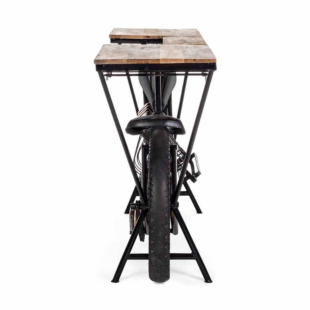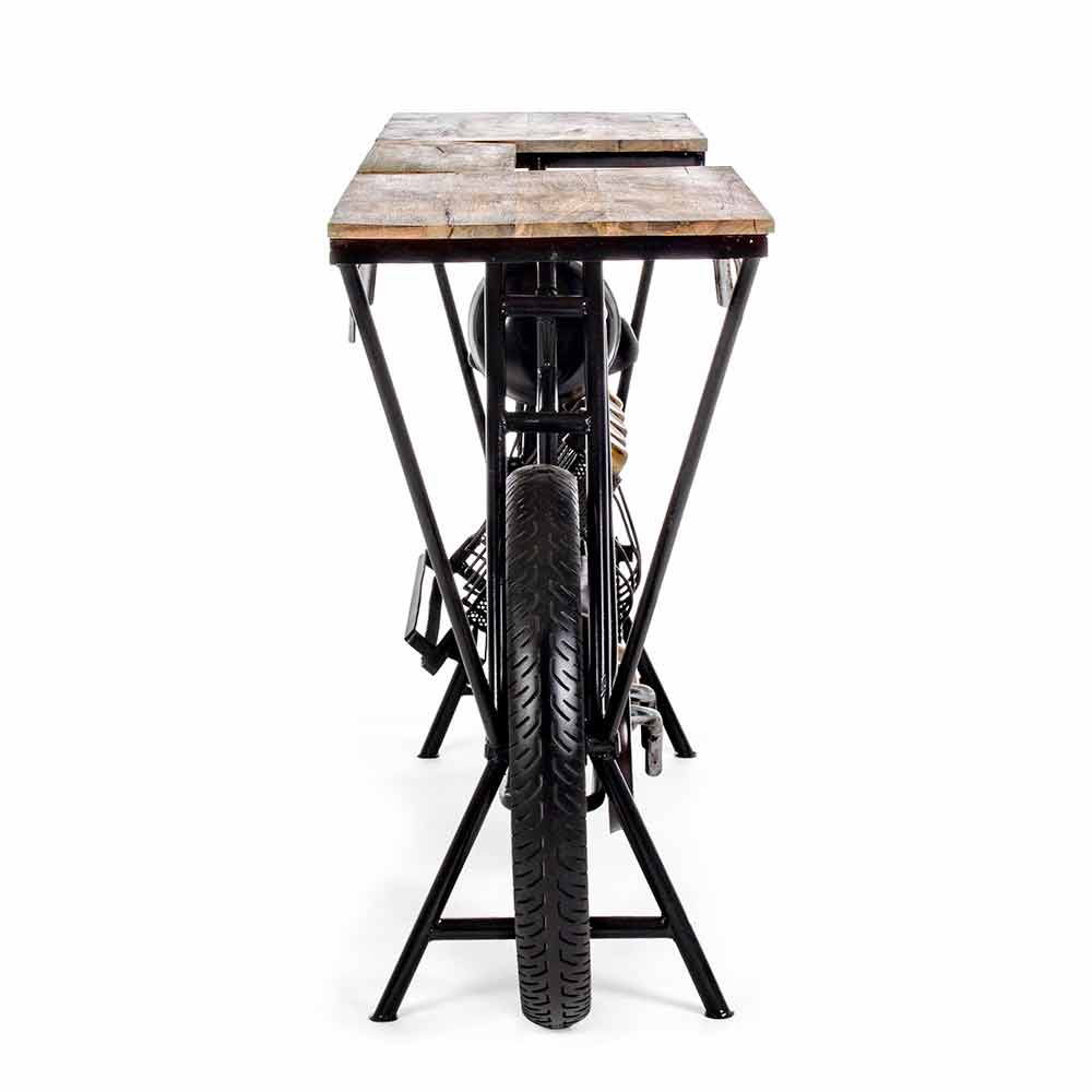 Originele en moderne stalen console met mangohouten blad en flessenhouder.