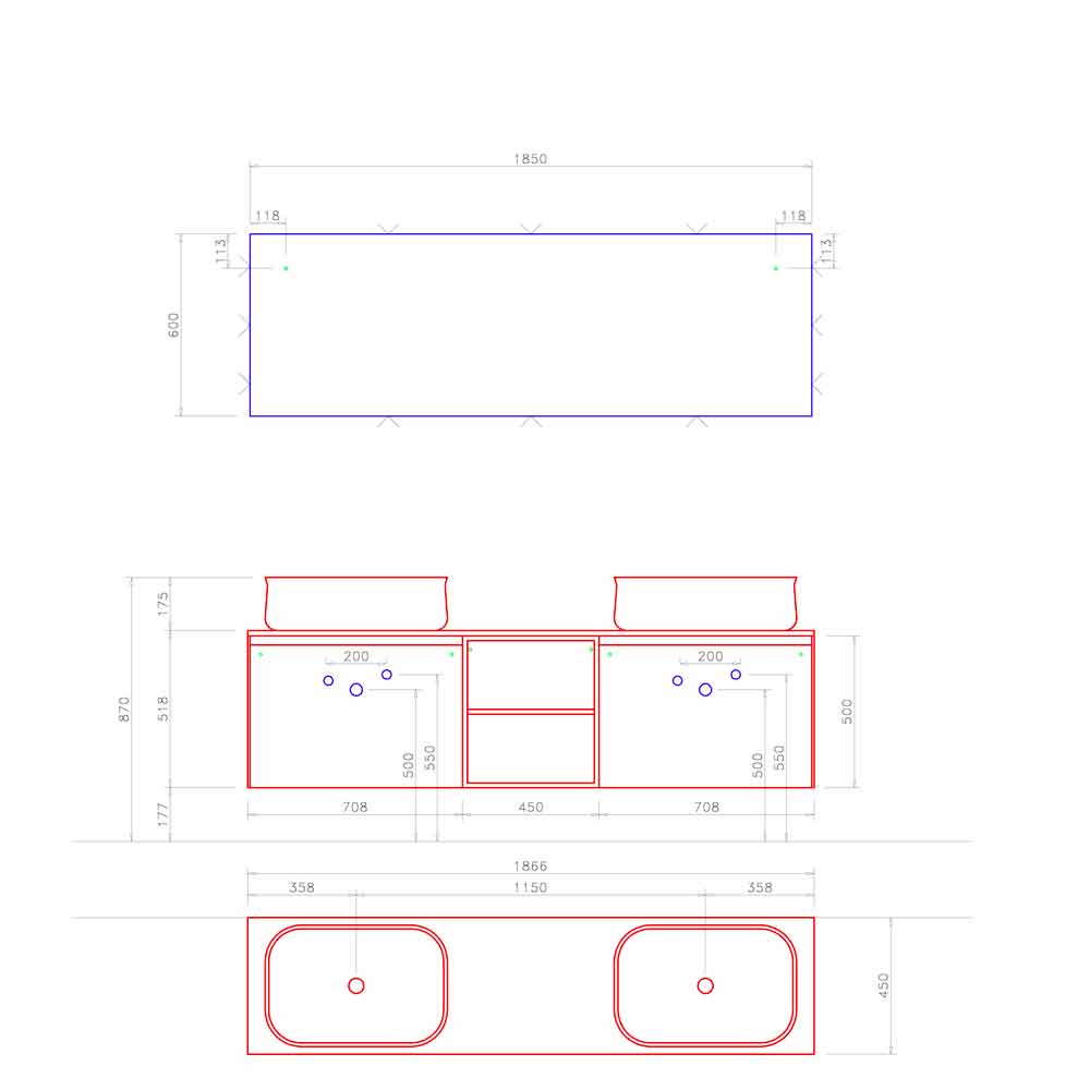 Het is een eigentijdse en symmetrische compositie, bedacht met een dubbele spoelbak en wandmeubel gescheiden door een open plank die het ontwerp schoon en opgeruimd houdt.
