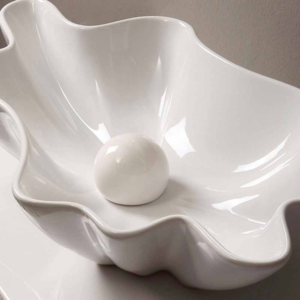 Wastafel die doet denken aan de zee door zijn parelvormige afvoer waardoor de illusie wordt gewekt dat het een oester is.