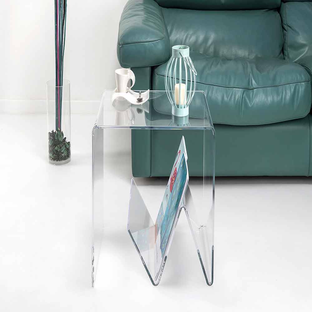 Kleine tafel / tijdschriftenrek in plexiglas, Cavour Het tafeltje CAVOUR heeft een praktisch en discreet ontwerp dat zowel als nachtkastje als koffietafel kan worden gebruikt, ook buiten. Het is gemaakt met acrylkristallijne PMMA 100% uit nieuwpolymeer en heeft een dubbele functie: het is een uiterst handig tafeltje en een praktisch tijdschriftenrek. De fysisch-technische kenmerken van het plexiglas (schokbestendig, niet-vervormbaar, onveranderbaar, thermisch isolerend) maken het tafeltje zowel geschikt voor binnen als buiten. De helderheid en schittering worden in de loop van de tijd onveranderd en ongewijzigd bewaard. Het gebruikte PMMA-plexiglas van nieuw polymeer in niet-toxisch, hypoallergeen, geurloos en antibacterieel. 100% recyclebaar. Dacht, ontworpen en gemaakt in Italië met Italiaans materiaal.