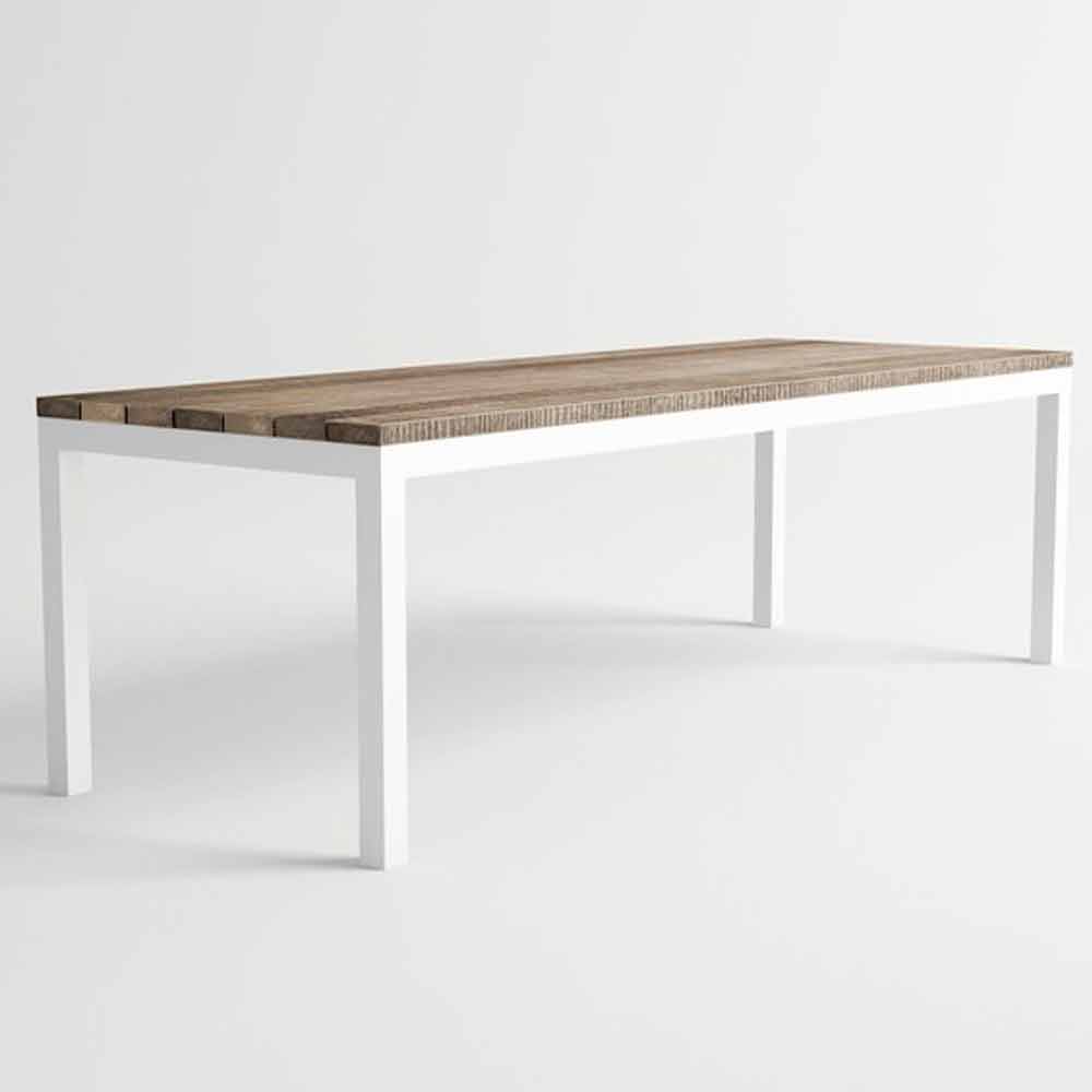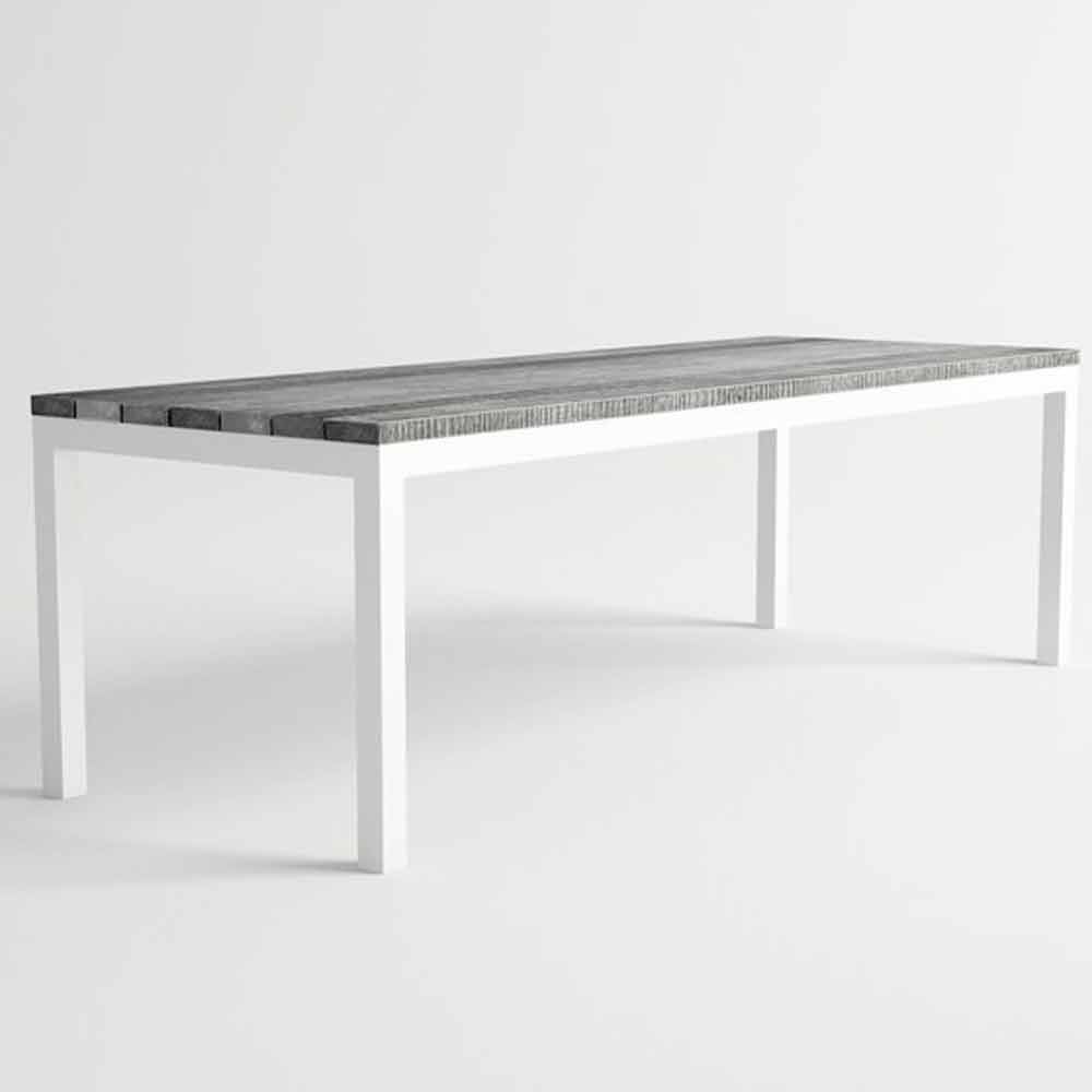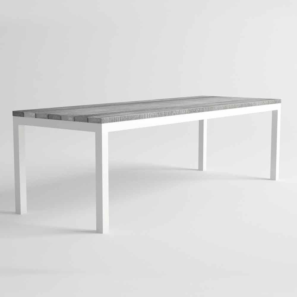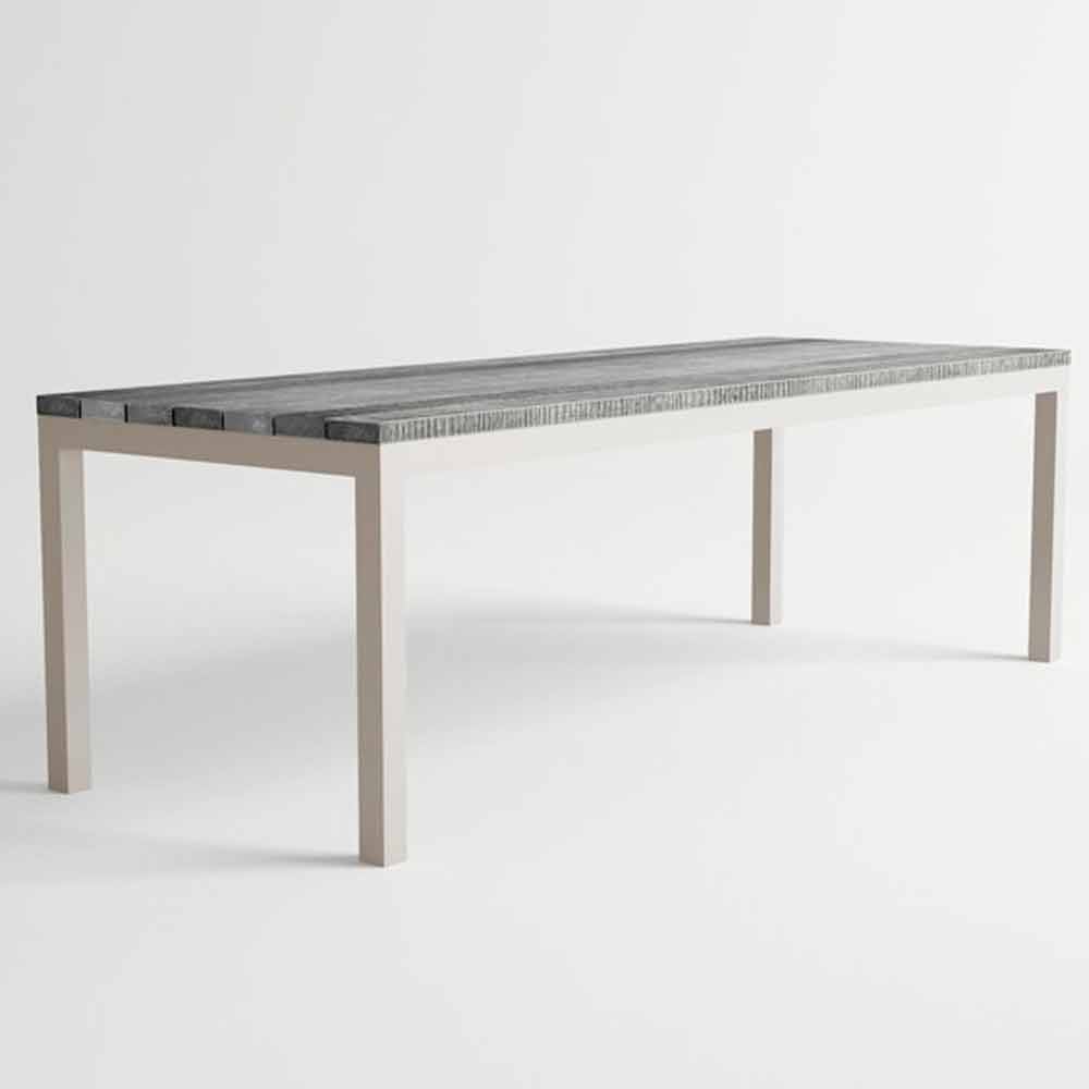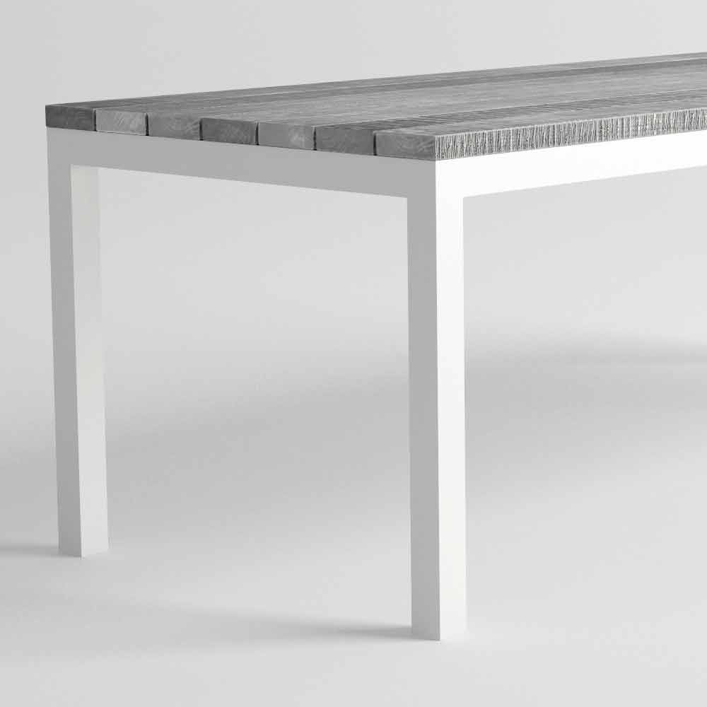 Modern design tuintafel, aluminium en houtstructuur, verkrijgbaar in verschillende kleuren.