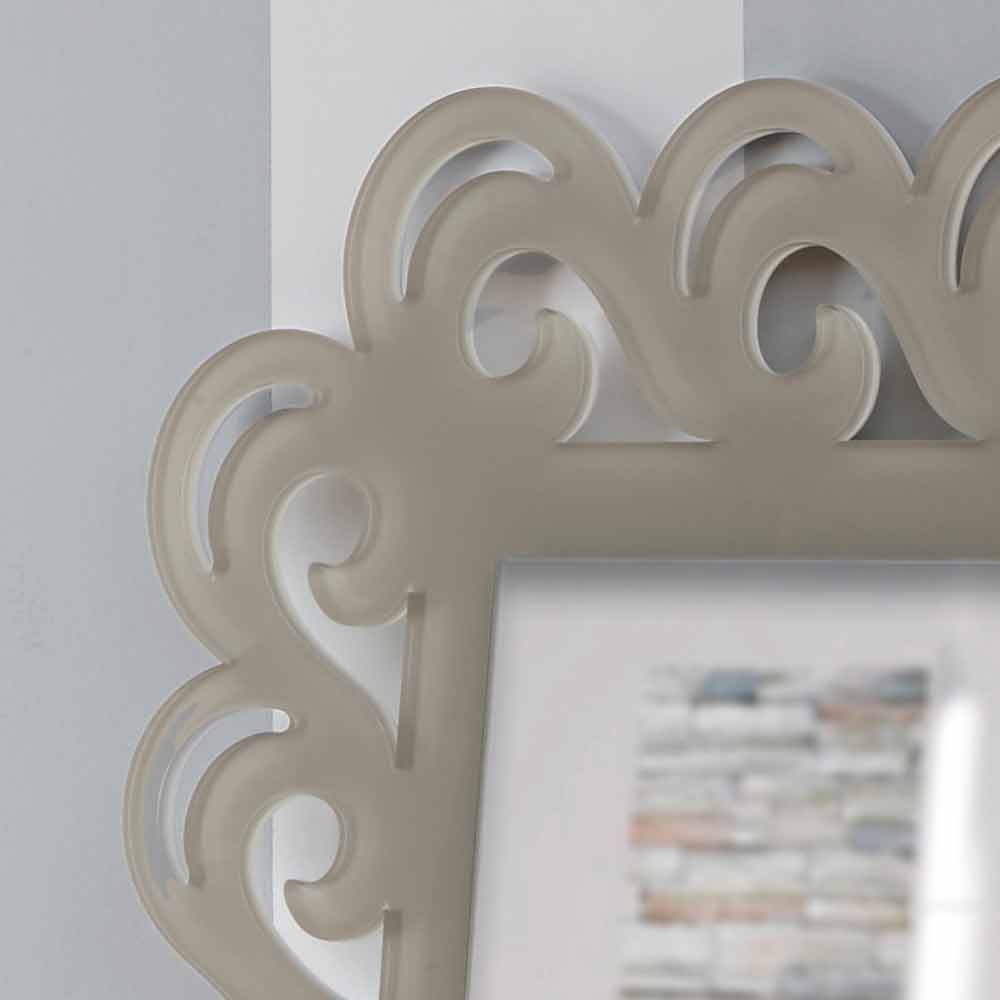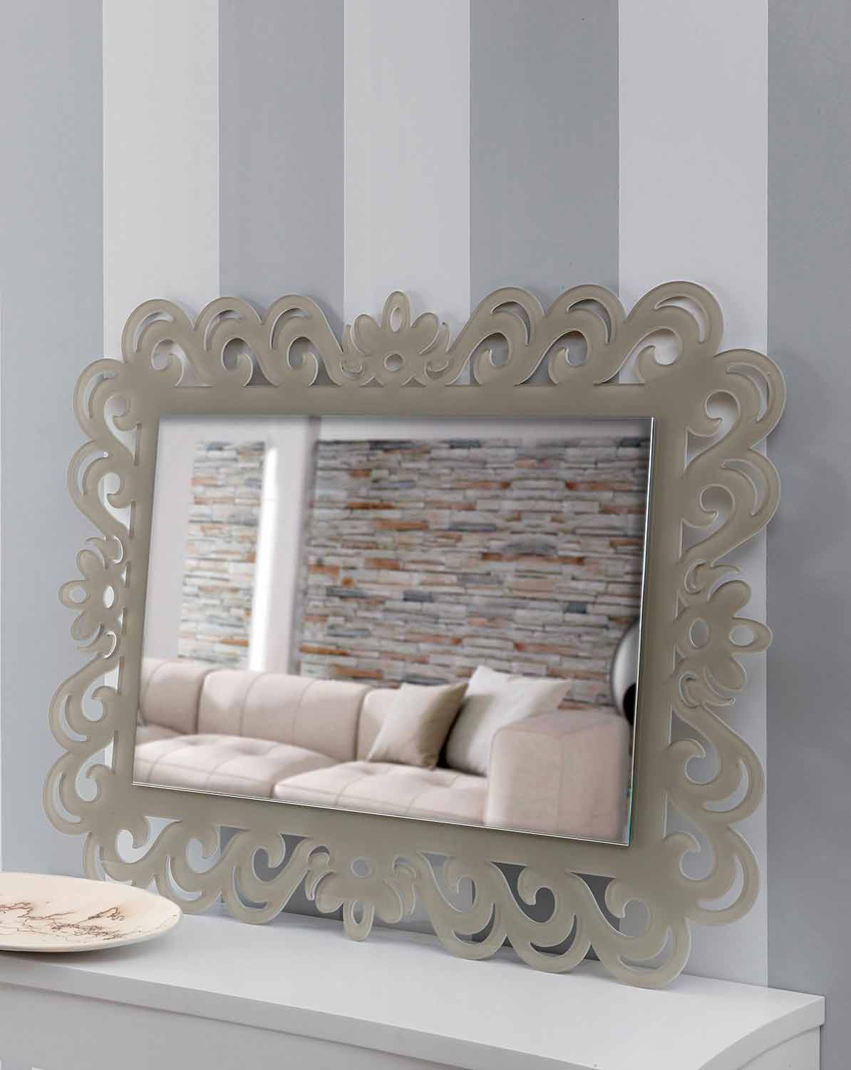 Rechthoekige wandspiegel met bloemenlijst, in duifgrijs plexiglas van modern design made in Italy.