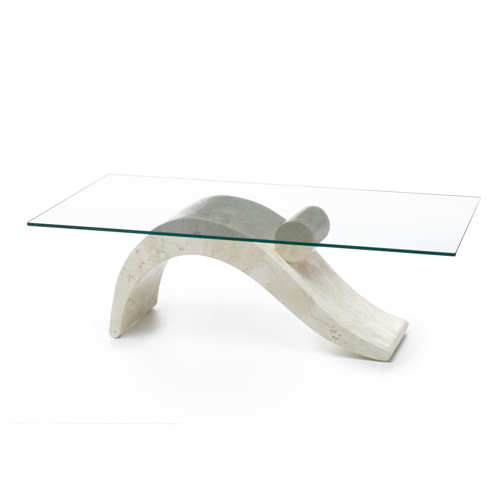 Het heeft een structuur van fossiele steen met een witte agaatafwerking en een blad van 10 mm gehard transparant gepolijst glas.