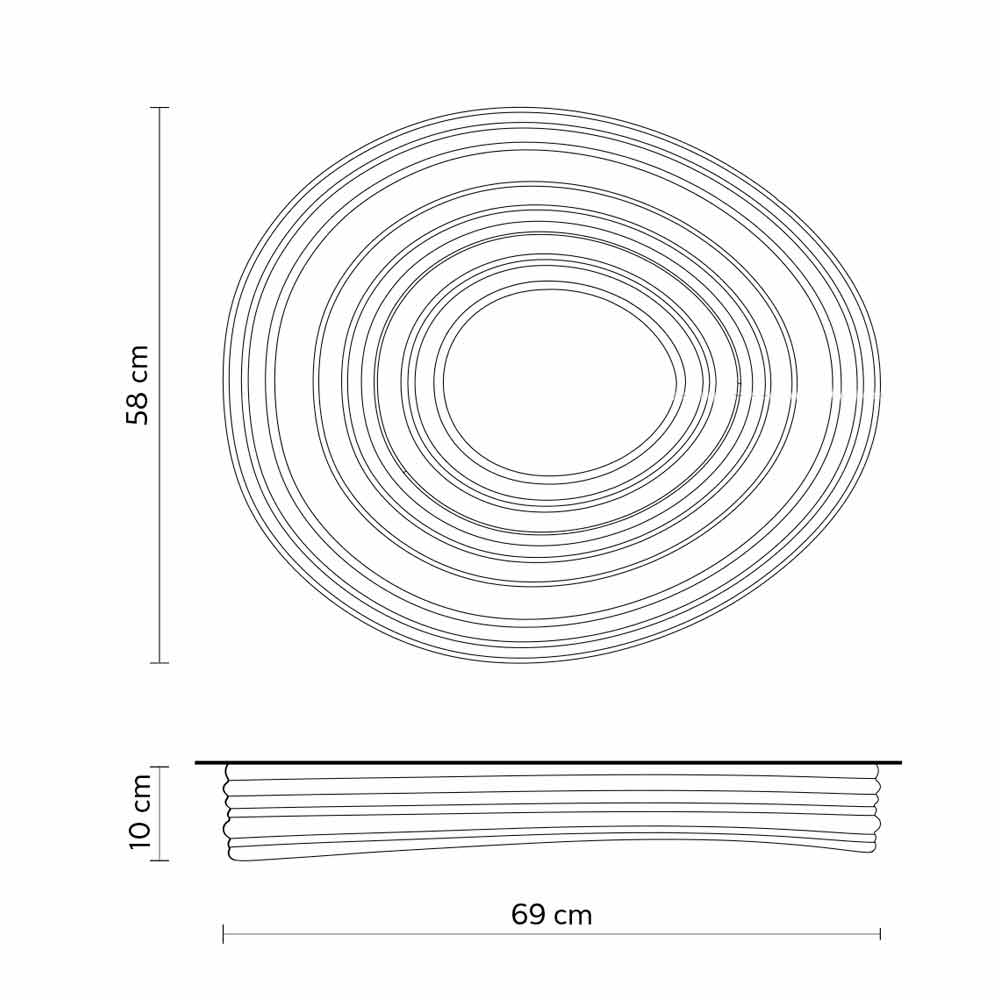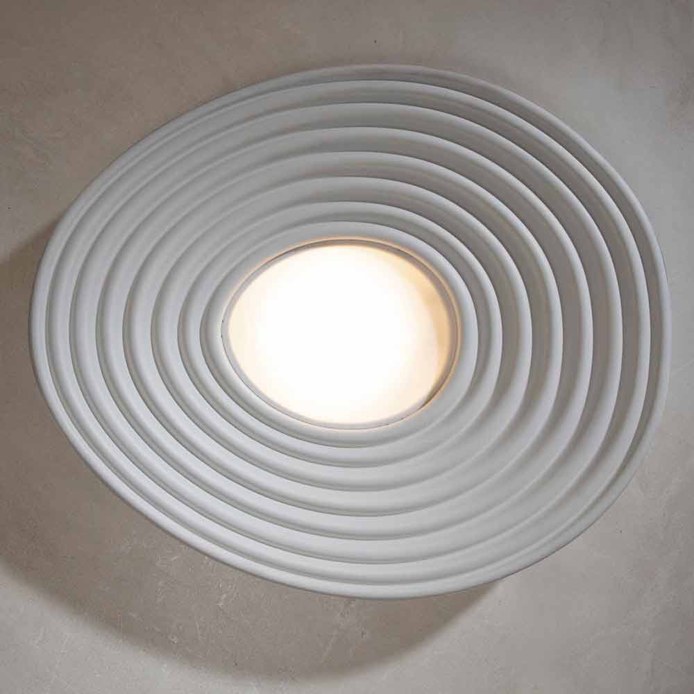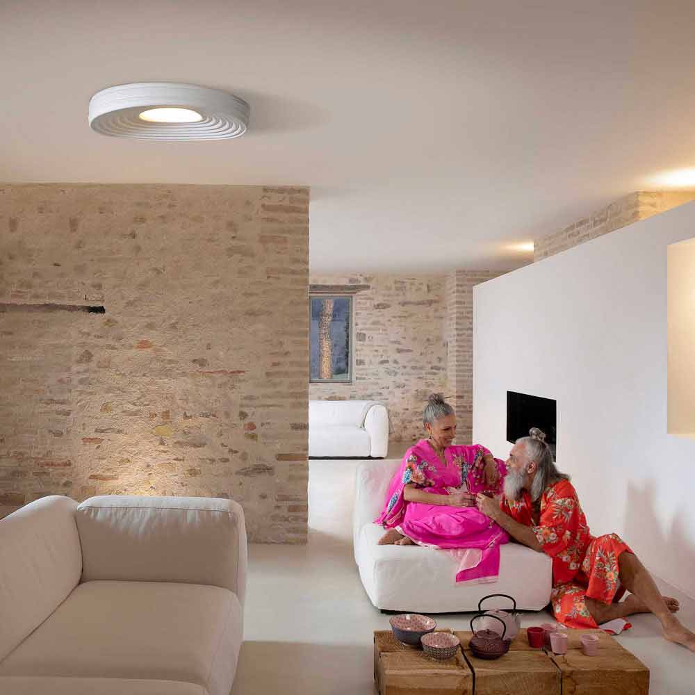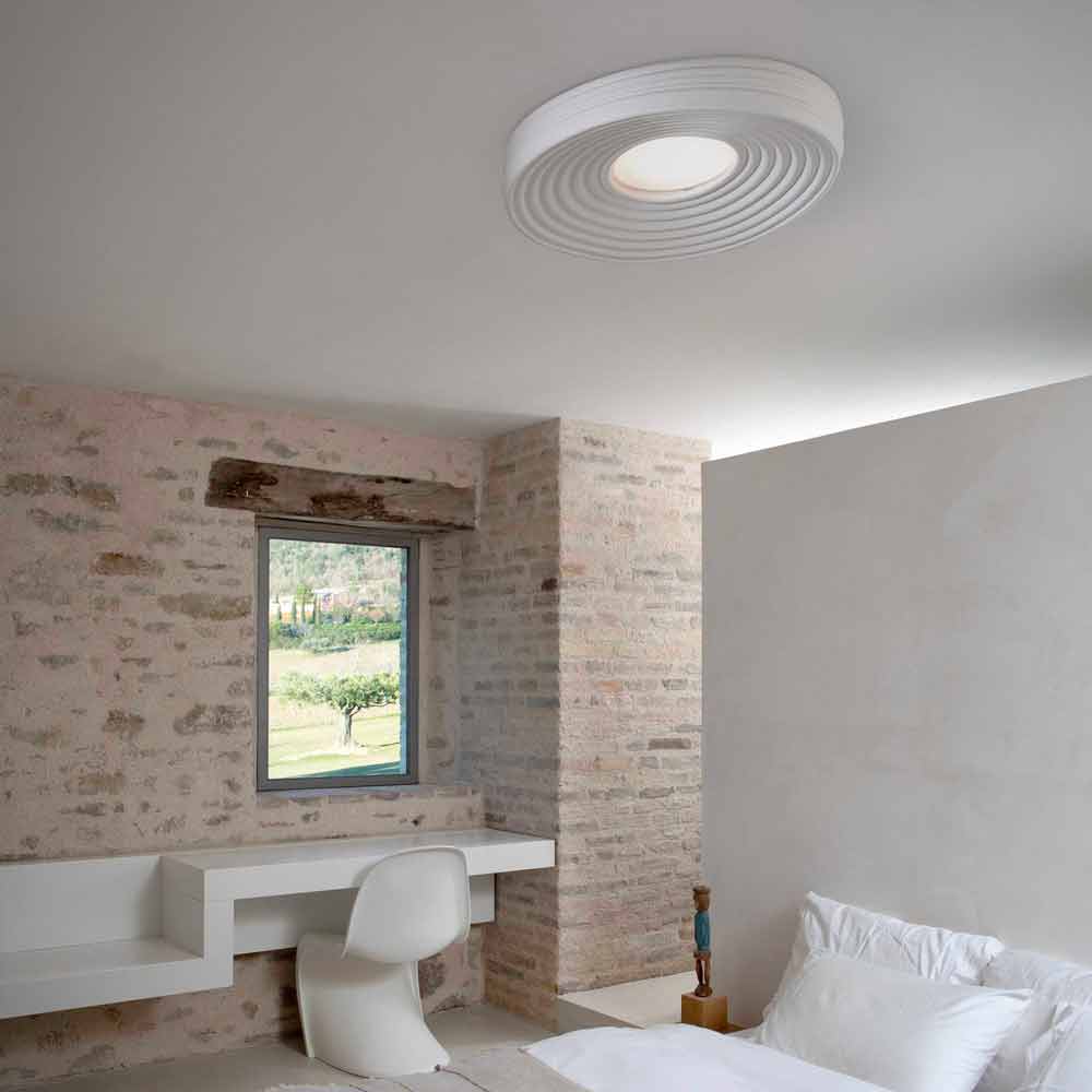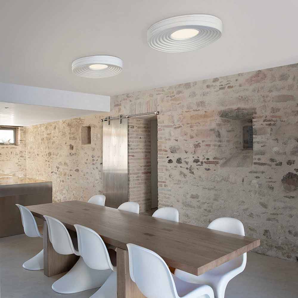 Deze originele en bijzondere plafondlamp creëert prachtige lichtspelen dankzij het centrale deel dat directe verlichting garandeert en dat zich voortplant op het oppervlak van de lamp en zichzelf reflecteert in concentrische cirkels.