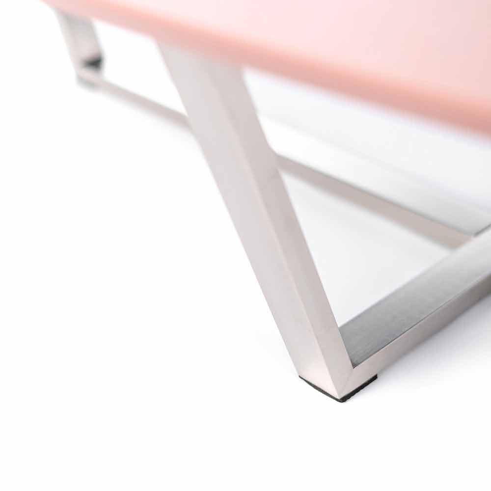 Moderne design salontafel met MDF blad en verchroomd metalen onderstel.