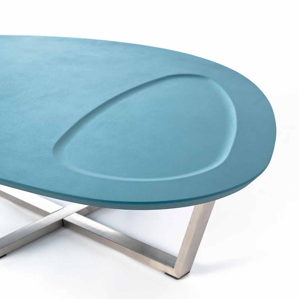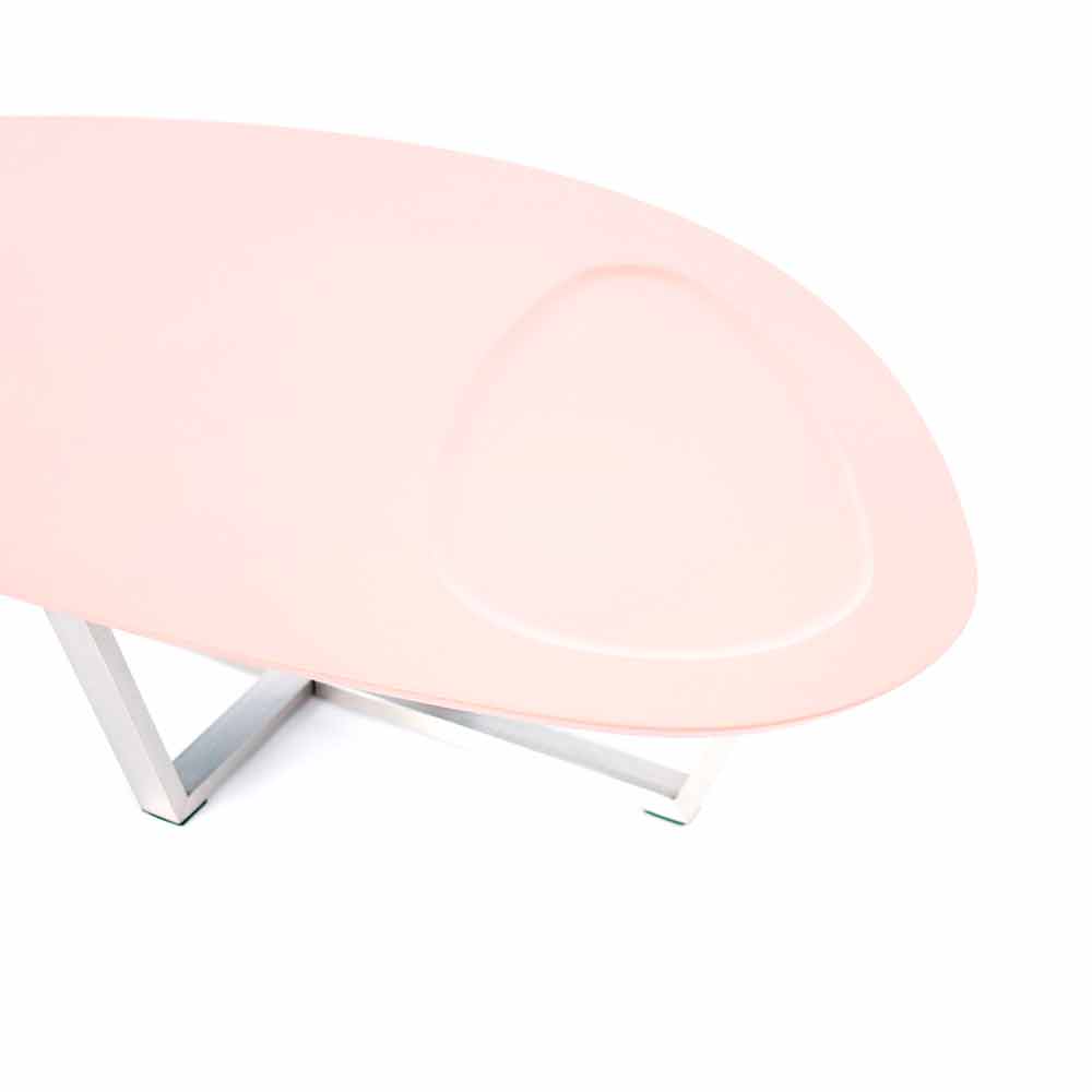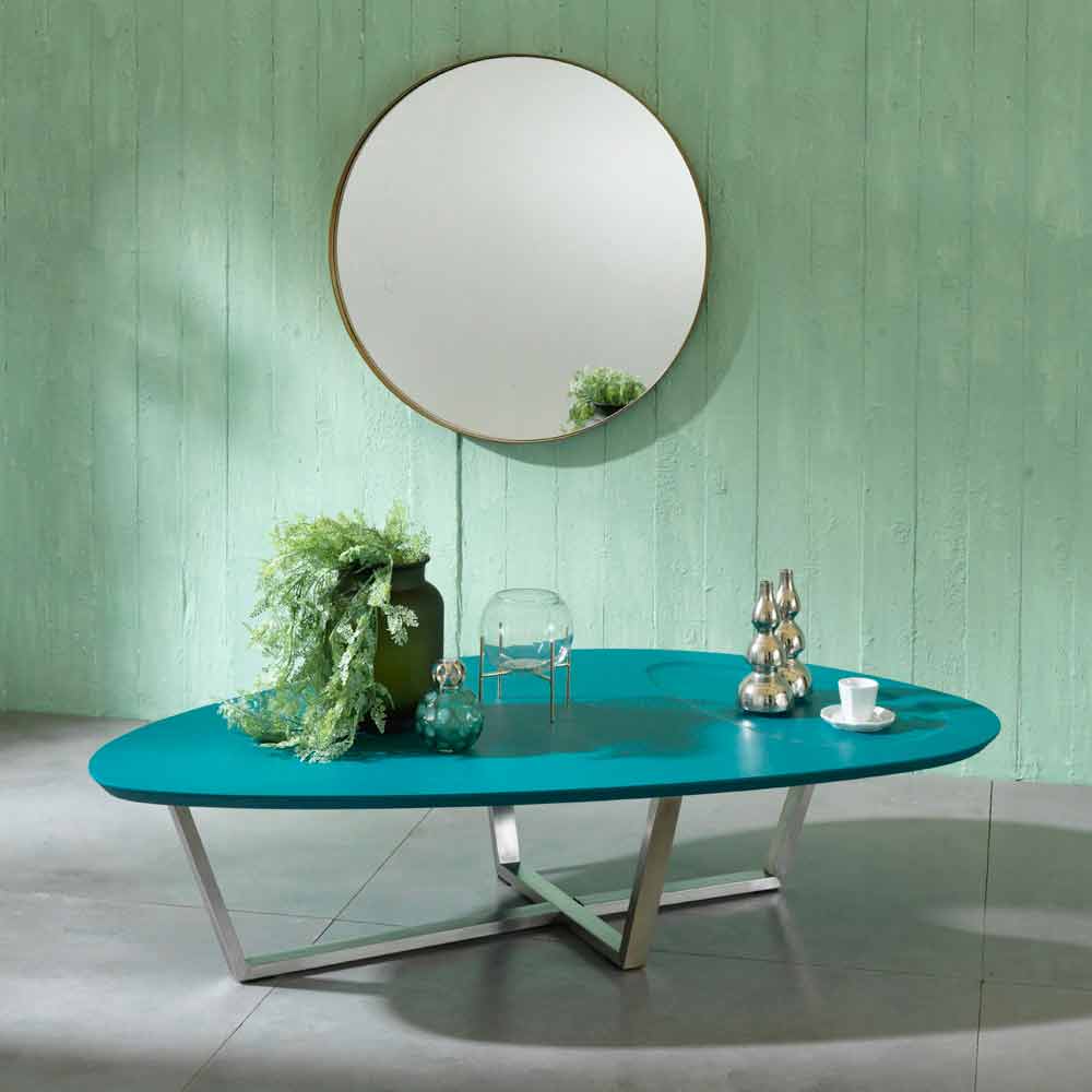 Donatella is een gevormde salontafel gemaakt met een MDF-blad en een verchroomd metalen onderstel.
