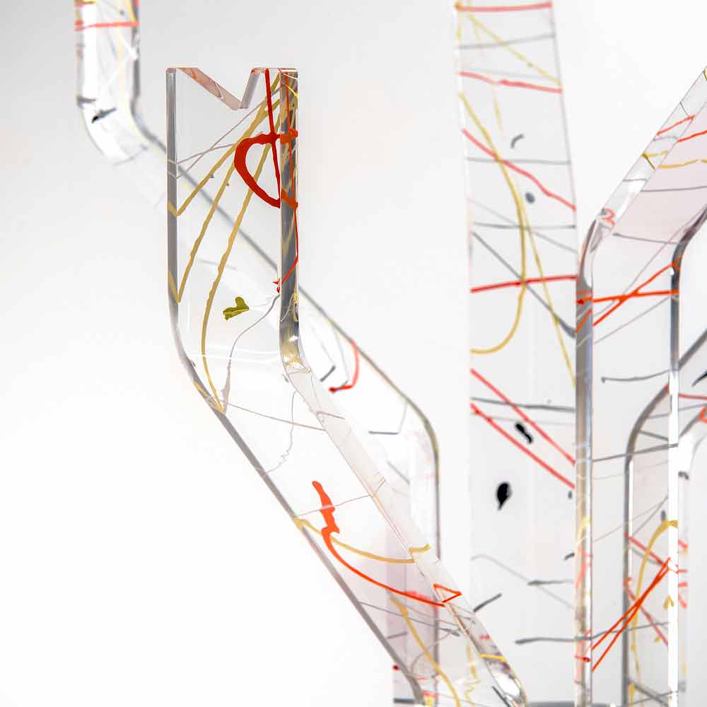 Andrea is een asymmetrische kleerhanger met 5 armen, gemaakt van 100% nieuw PMMA-plexiglas van polymeerpolymeer met spuitverfafwerking waardoor het veelkleurig is.