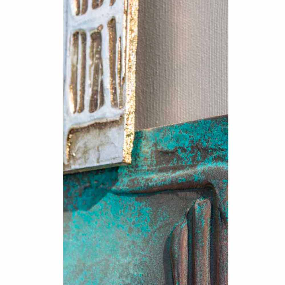 - Taupe gelakte stof structuur met acht materiële elementen, goud, zilver, roest-geëtste bronzen afwerking, overlappende en met de hand versierde afwerkingen.