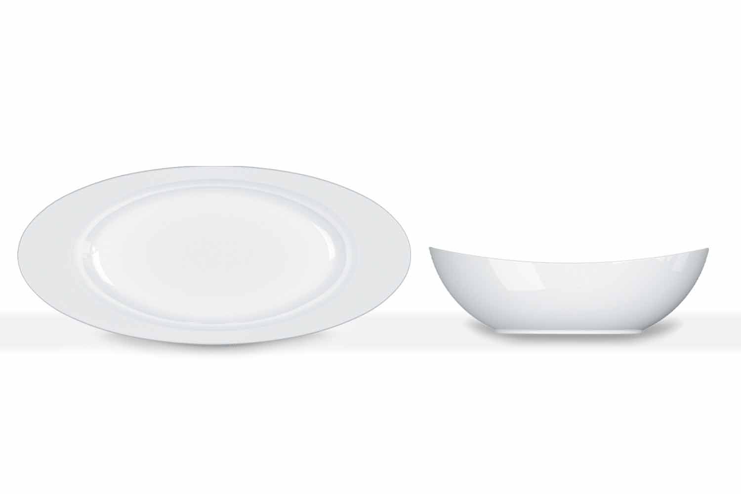 Serveerset modern ovaal design in wit porselein, 2 stuks.