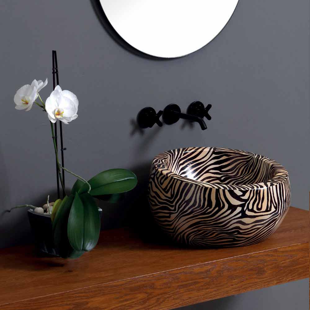 Elisa is een oranje zebra finish keramische aanrecht wastafel met lichte en beslissende lijnen.