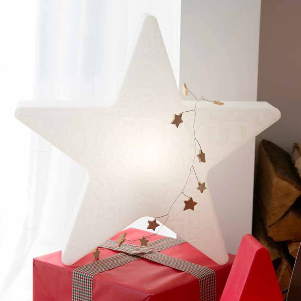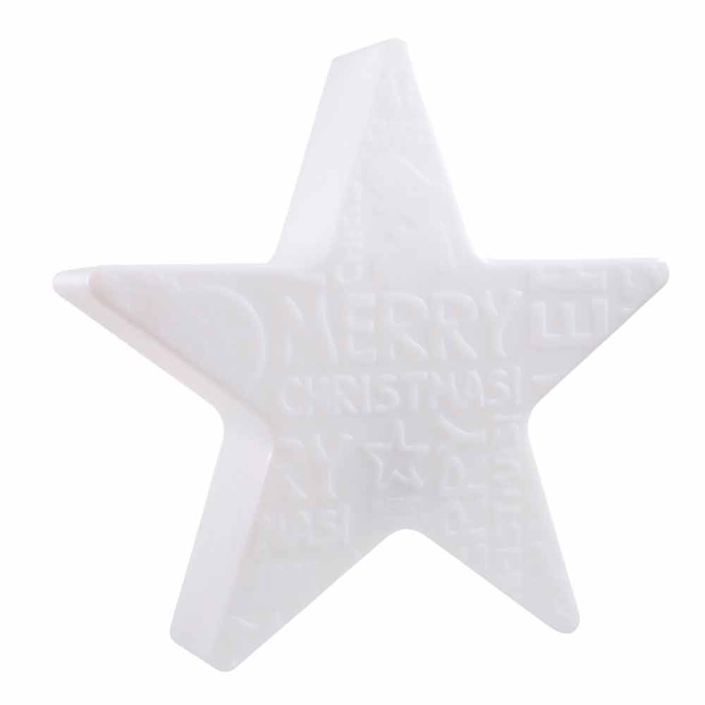 Deze tafellamp voor binnen of buiten kenmerkt zich door zijn opvallende stervormige design met reliëfopdruk in reliëf met kerstthema aan de voorkant, terwijl de achterkant glad blijft. Een decoratief lichtpunt dat de ziel en het hart verrukt en een sprankelende en moderne sfeer creëert, ideaal voor de kerstperiode .