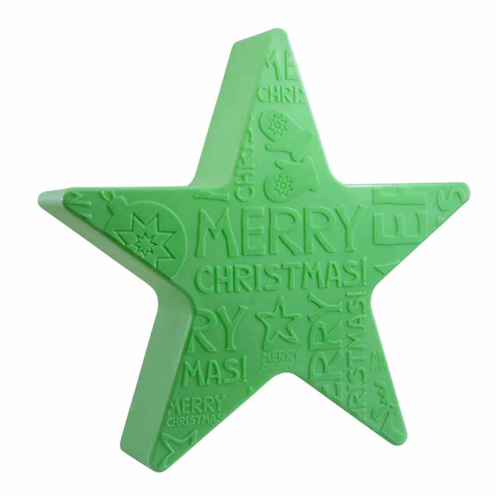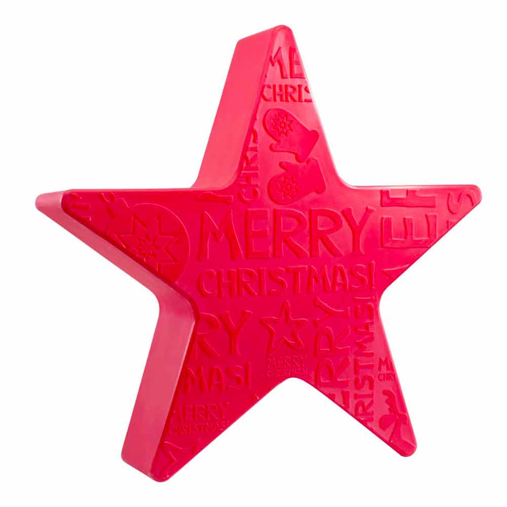 Stervormige vloer- of tafellamp met eenzijdig kerstmotief in reliëf gemaakt van polyethyleen voor binnen- of buitengebruik.