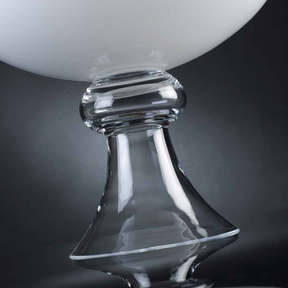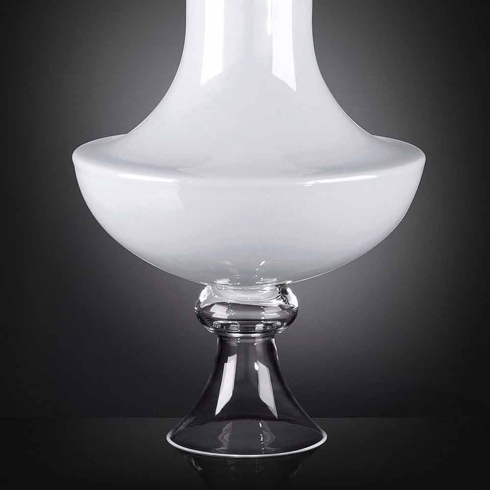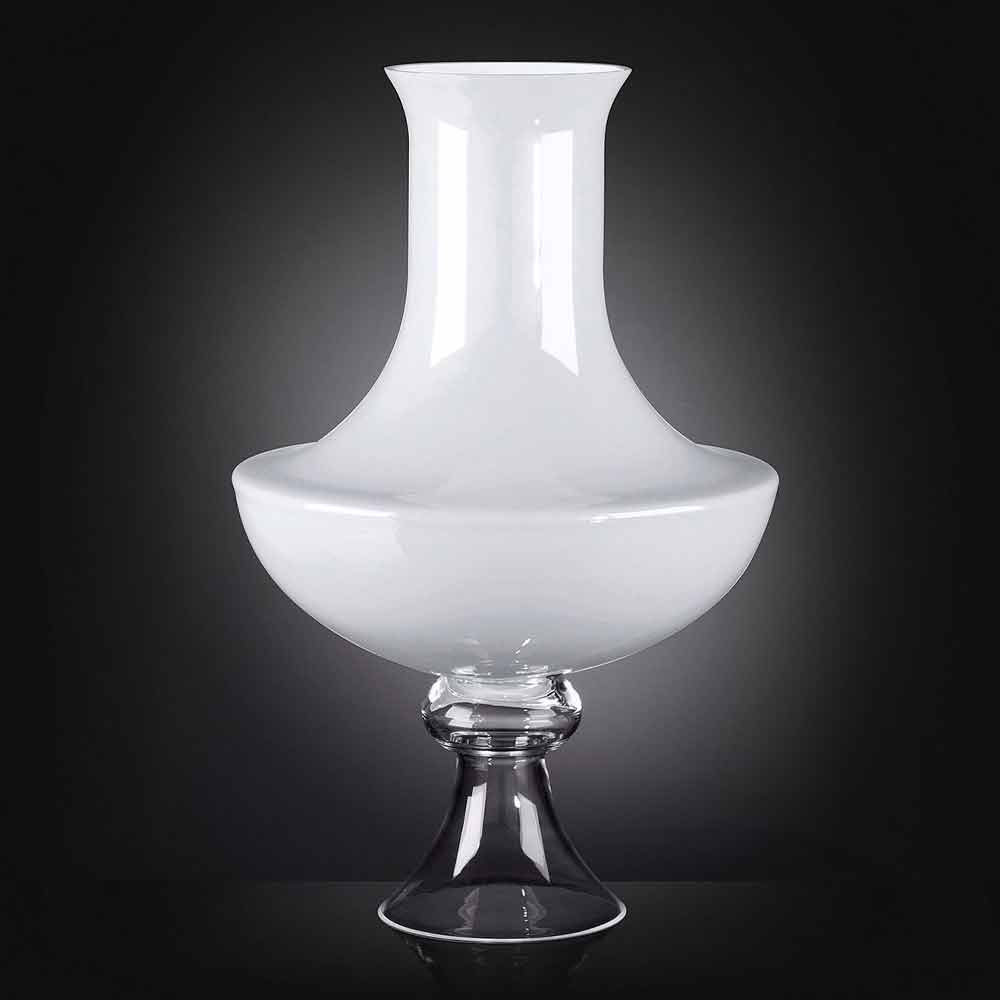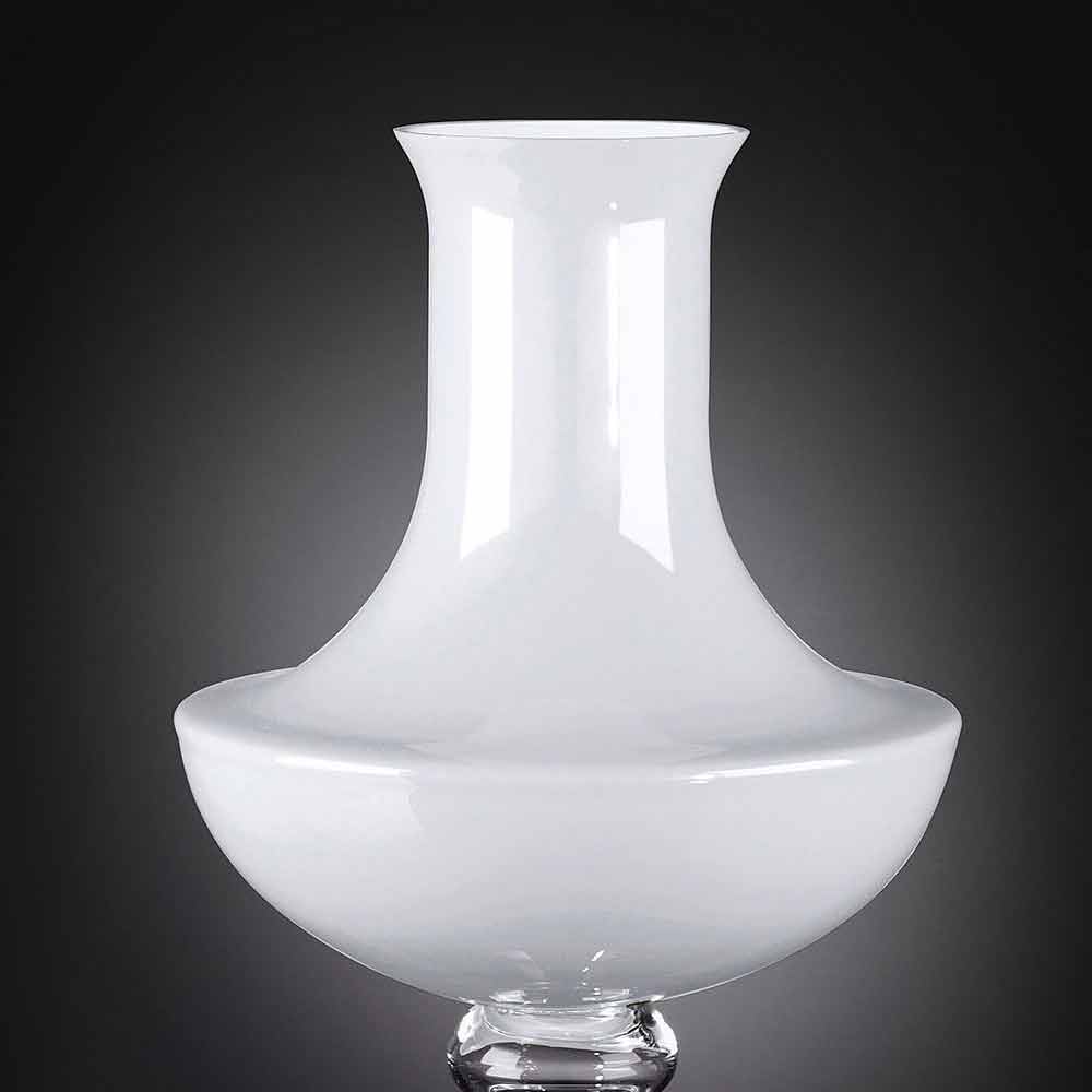 Moderne interieurvaas in wit glas met transparante basis gemaakt volgens een 100% Made in Italy-proces . Een aanvulling die wordt gekenmerkt door een eenvoudige en strakke esthetiek en een figuur omlijnd door zachte vormen en golvende lijnen waardoor het in elke omgeving met een verfijnde stijl kan worden gebruikt, mede dankzij de tijdloze elegantie van glas, een hoogwaardig materiaal van hoge waarde. . Een ideaal ontwerp voor de meest uiteenlopende omgevingen, van woninginrichting tot die van hotels, restaurants, contractruimtes, spa's, maar ook als decor voor evenementen en bruiloften.