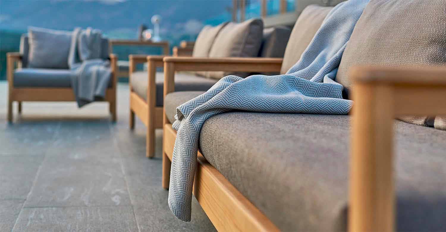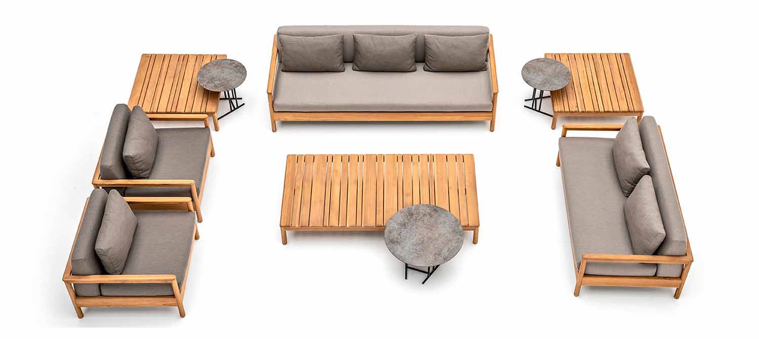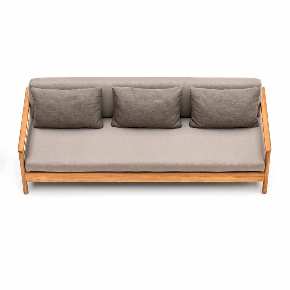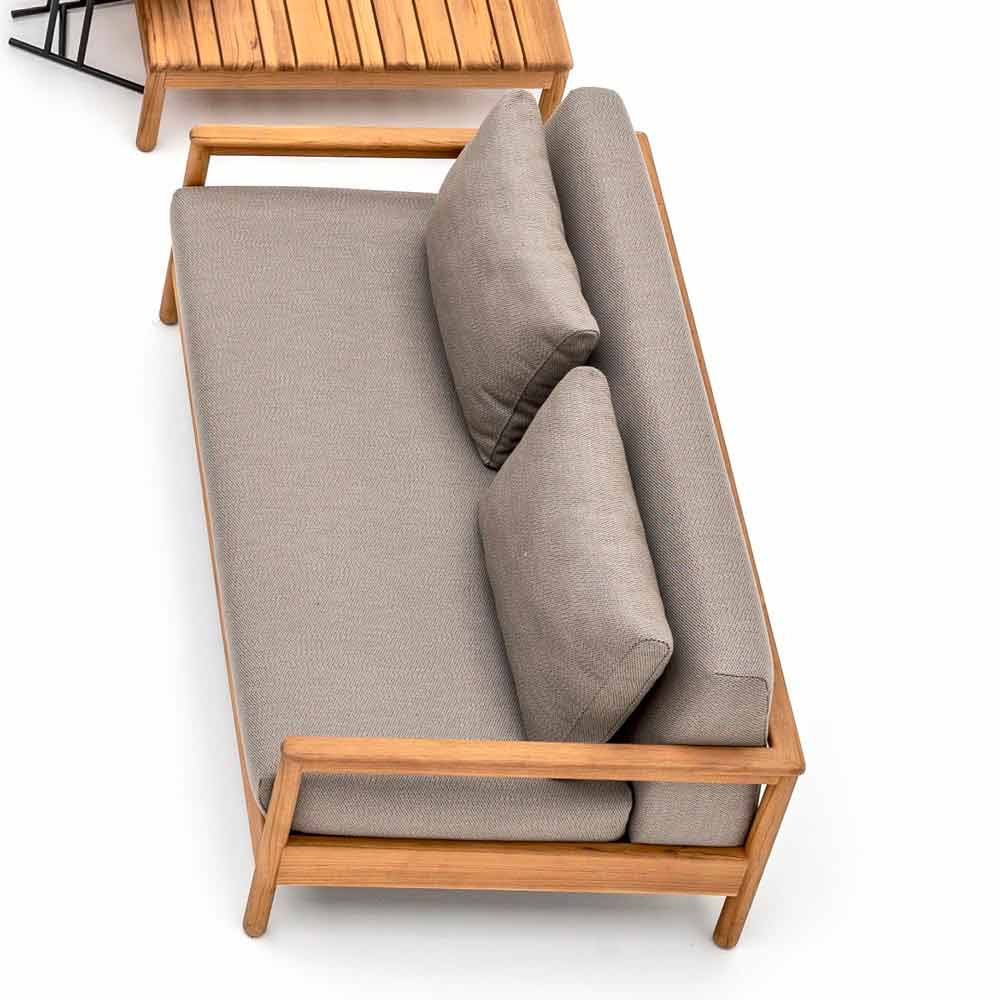 Bali is een geweldige tuinbank, gekenmerkt door een zichtbare ondersteunende structuur in gecertificeerd massief teakhout en stoelen en dubbele ruggen bedekt met stof en opgevuld met Dryfeel-rubbers.