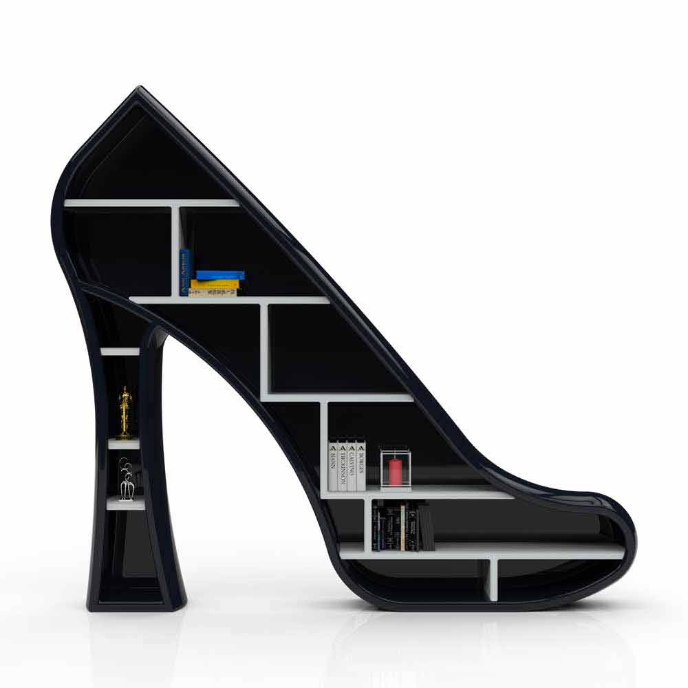Designobject of gril? Bookcase Lady is niets meer dan de transpositie naar het ontwerp van het vrouwelijke object bij uitstek: de schoen met de hak.