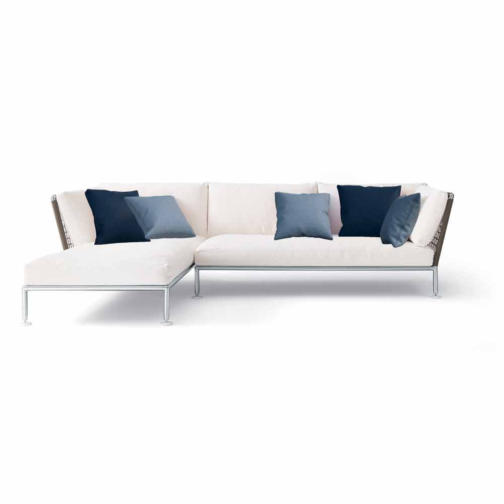 Het kan in een hoek van het terras, in de tuin of in alle ruimtes worden geplaatst waar u momenten van rust en ontspanning kunt creëren zonder de onmiskenbare stijl van made in Italy op te offeren, de hoekbank met chaise longue heeft een structuur van gesatineerd