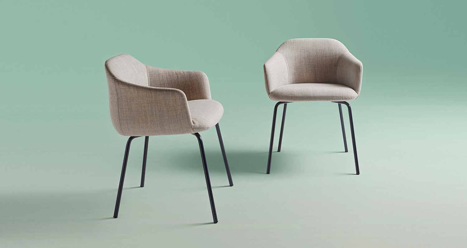 doorlopende en golvende lijnen van de rugleuning en de zitting, beide opgevuld met polyurethaanschuim en rustend op een dun strijkijzer. structuur.