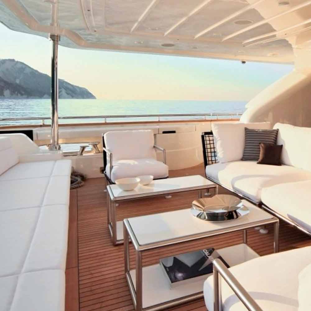 kussens met dryfeel-vulling en afneembare hoes in outdoorstof. De onbreekbare voetjes zijn gemaakt van wit Teflon.