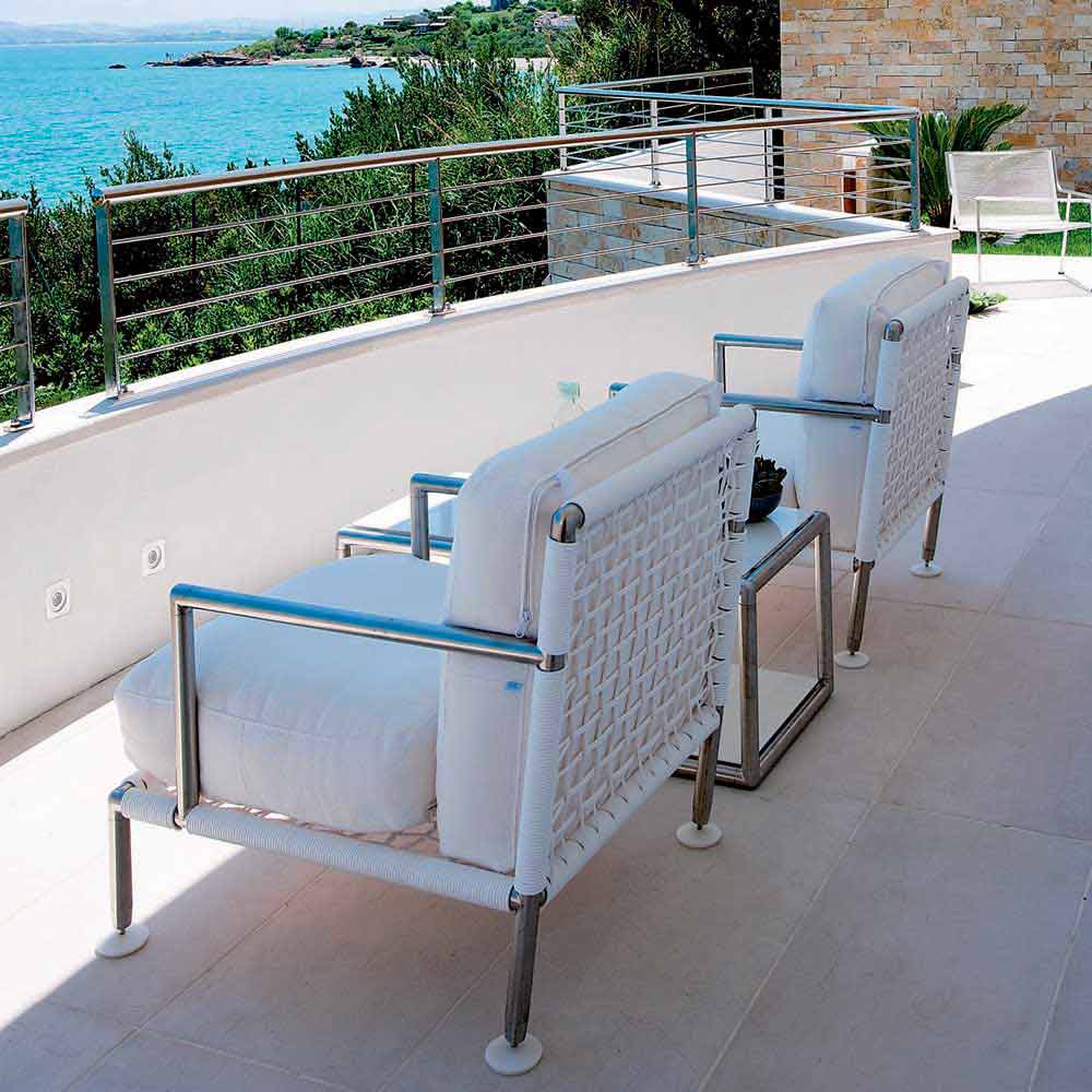 Hij kan in een hoek van het terras, in de tuin of in alle ruimtes worden geplaatst waar u momenten van rust en ontspanning kunt creëren zonder de onmiskenbare stijl van made in Italy op te offeren, de fauteuil heeft een structuur van gesatineerd