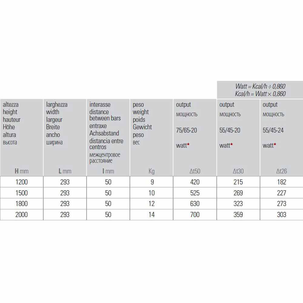 Verkrijgbaar in verschillende maten *:- H 1200 x L 293 x Inter. 50 mm x uitgang w (Δt50 *) 420; Opbrengst w (At30 *) 215; Opbrengst w (A26 *) 182;