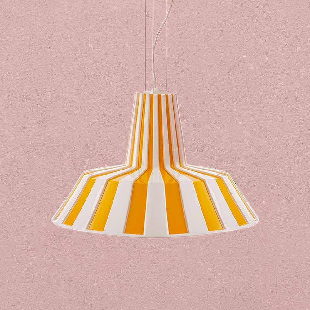 Het design van deze lamp is modern, gebaseerd op contrasten, maar heeft ook een vage retro feel. Met Budin kun je je fantasie de ruimte geven door de woonkamer, de woonkamer of de keuken in te richten met lichtpunten met levendige en originele kleuren. Het is gemaakt in Italië en is gemaakt van keramiek, in een tweekleurige afwerking. Het is ook uitgerust met een reflecterende interne parabool en roestvrijstalen steunkabels waarmee de hoogte tijdens de installatie kan worden aangepast.