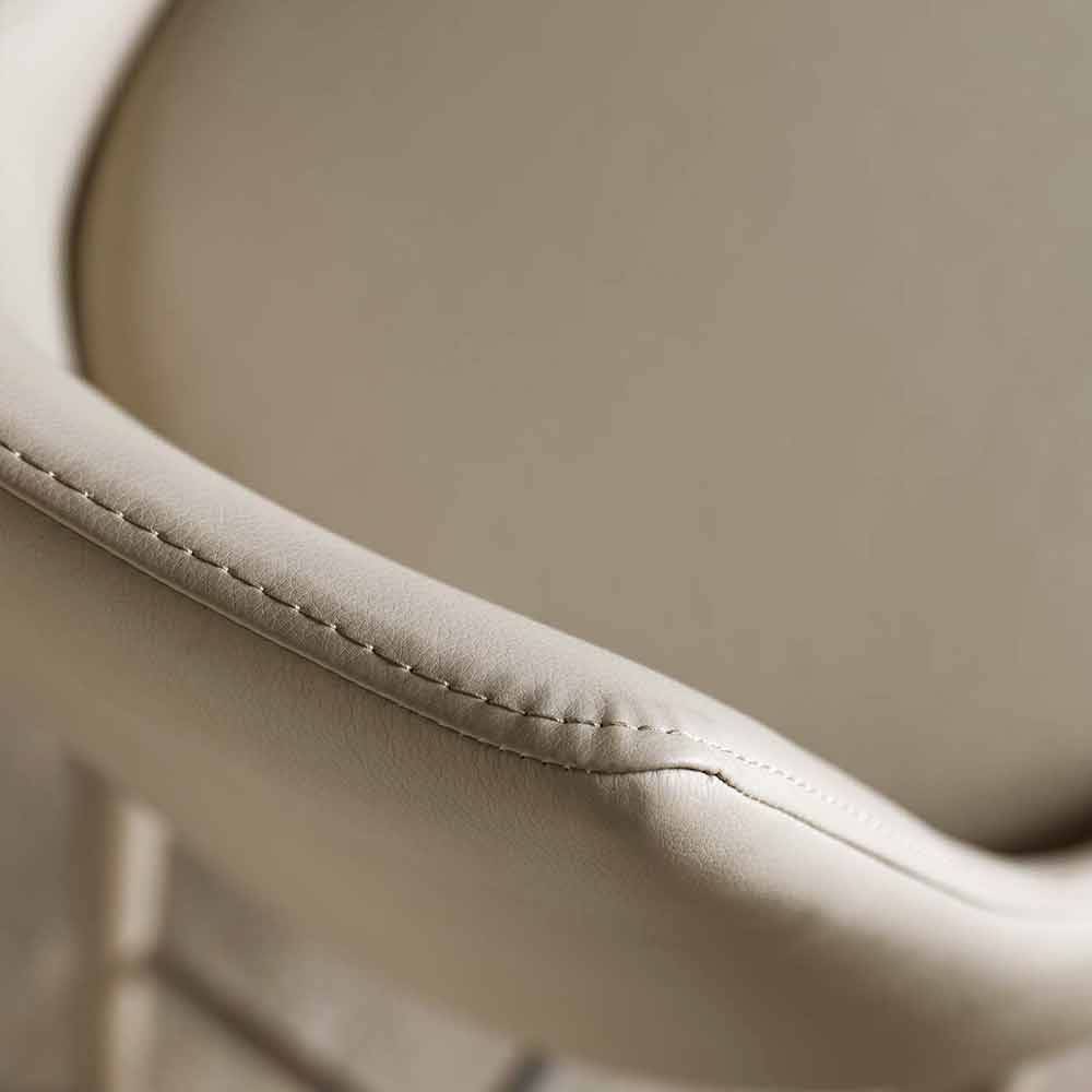 De structuur is in plaats daarvan geverfd metaal in dezelfde kleur, terwijl de zitting is gemaakt van eco-leer.