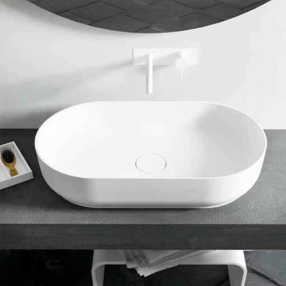 Dalmine is een vrijstaande wastafel met een ovale en zachte vorm, ideaal voor moderne en minimalistische omgevingen. Het water lijkt te worden gestreeld door de delicate en natuurlijke lijnen van deze gootsteen.