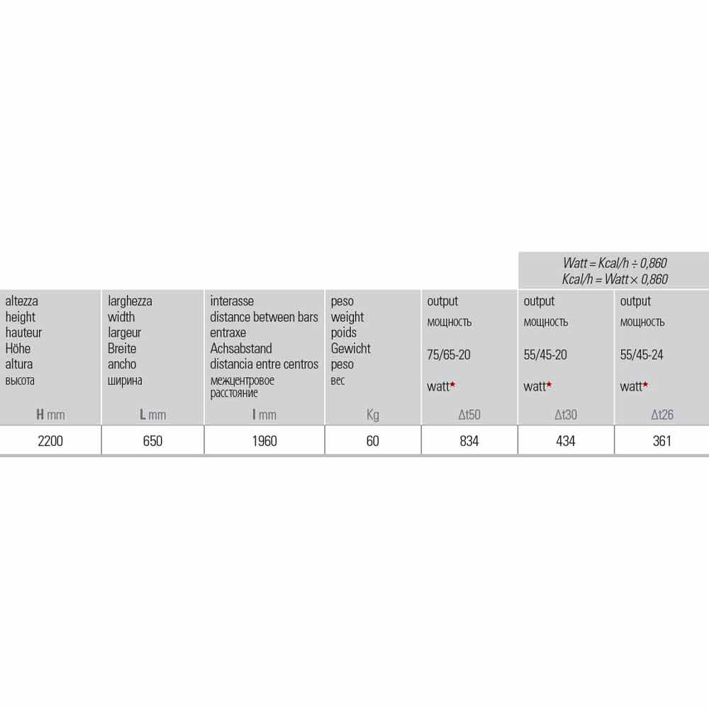 Maat: H 2200 x L 650 x Inter. 1960 mm x uitgang Δt50 834 W, Δt30 434 W, Δt26 631 W.