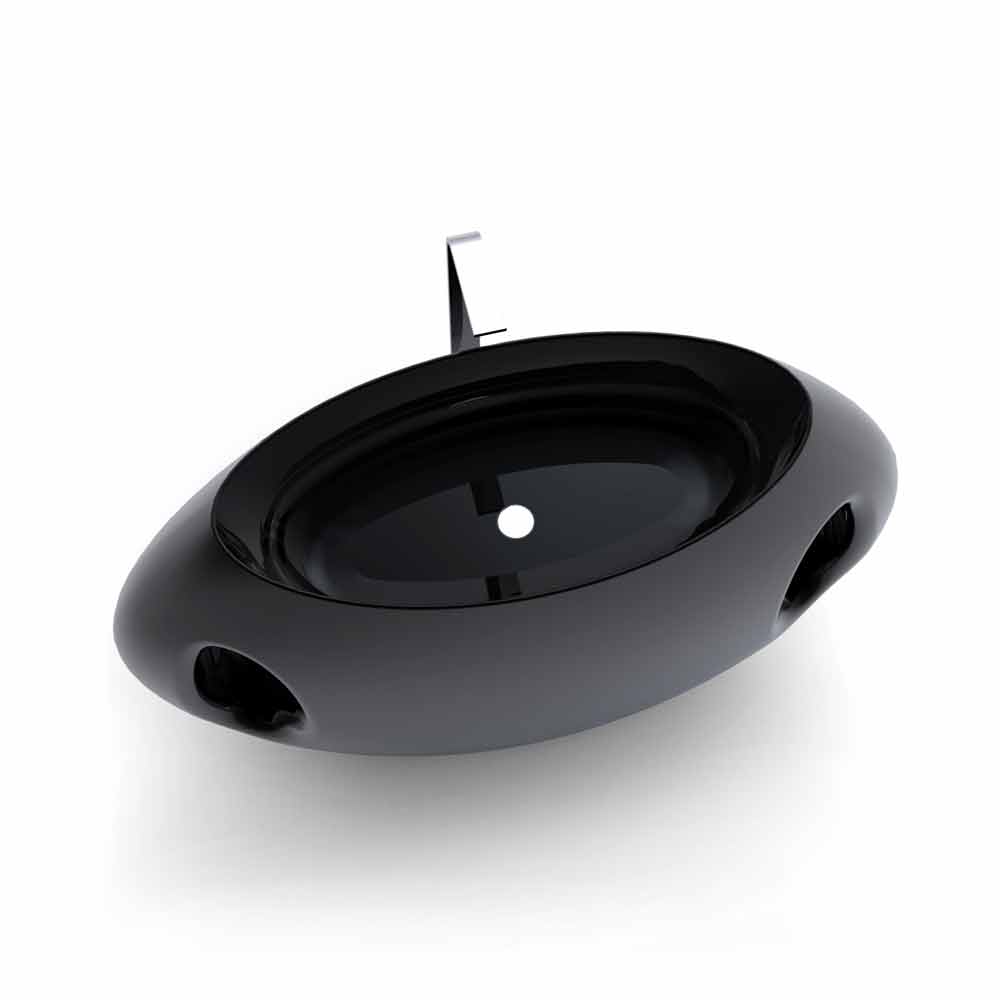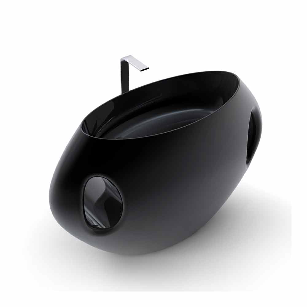 Solid Surface scenografische wastafel; vrijstaand, met vormen geïnspireerd op grote klassieke vazen. Het wordt gekenmerkt door elliptische geometrielijnen, breed en uitgerekt, die het complement markeren. De royale vormen en de twee ellipsen in de vorm van "handvatten" tonen een profiel dat doet denken aan de vorm van een grote vaas. De naam "Pandora" verwijst in feite naar de beroemdste van de oude schepen die behoren tot de wereld van de Griekse mythologie, de mythische doos van Pandora. Zijn kenmerken, naast het in de breedte "uitgerekt" vasiform profiel, ook een comfortabele en brede waskom met een horizontale snit en twee elliptische decoratieve sleuven aan de fronten, die het van links naar rechts kruisen, ook dienend als handdoekhouder. Het sanitair armatuur heeft een goede ergonomie, omdat het rijkelijk rond is, verkrijgbaar in twee kleurvarianten: Wit (RAL9003) of Zwart (RAL9005)