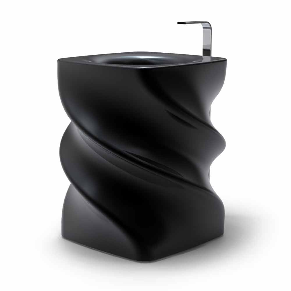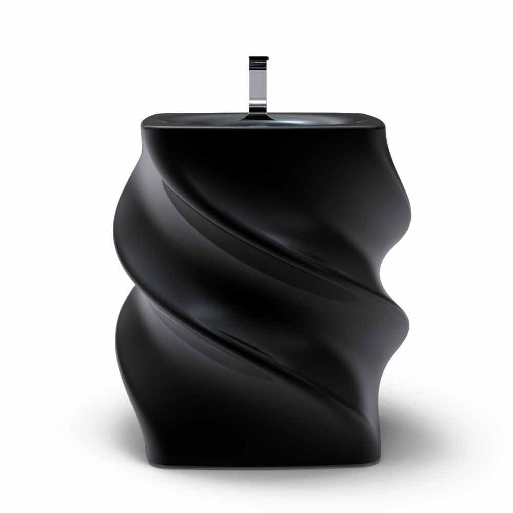 Vrijstaande wastafel met "geschroefde" vormen in Solid Surface; De omhullende lijnen tonen een profiel dat doet denken aan de "draai" van de schroefdraad van een schroef, waaraan het zijn naam in het Engels "Twist" ontleent. De kenmerken zijn een "golvend" profiel en een enigszins "gedraaide" vorm op zichzelf, afkomstig van verschillende windingen of rotaties gemaakt in de torsie van een vaste stof met een vierhoekige basis, maar dit kenmerk wordt echter geannuleerd in het begin- en eindgedeelte. Het sanitair armatuur heeft een halfbolvormige bak met platte delen die hem raken, geschikt om alles in te plaatsen wat voor het toilet gebruikt kan worden. Het is ook ergonomisch, aangezien het in ieder geval afgerond is in de delen met zichtbare draad. Gekenmerkt door een glanzende / matzwarte afwerking (RAL9005) wat het een zekere elegantie geeft.