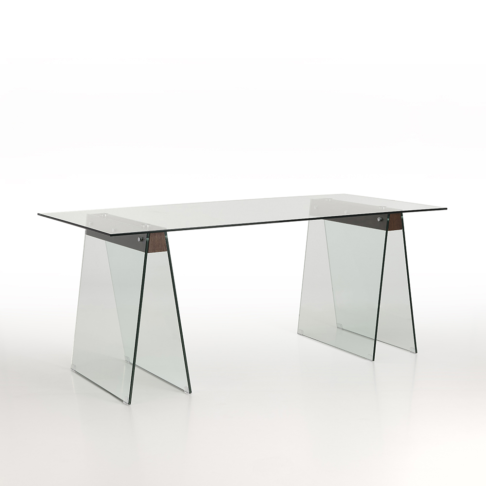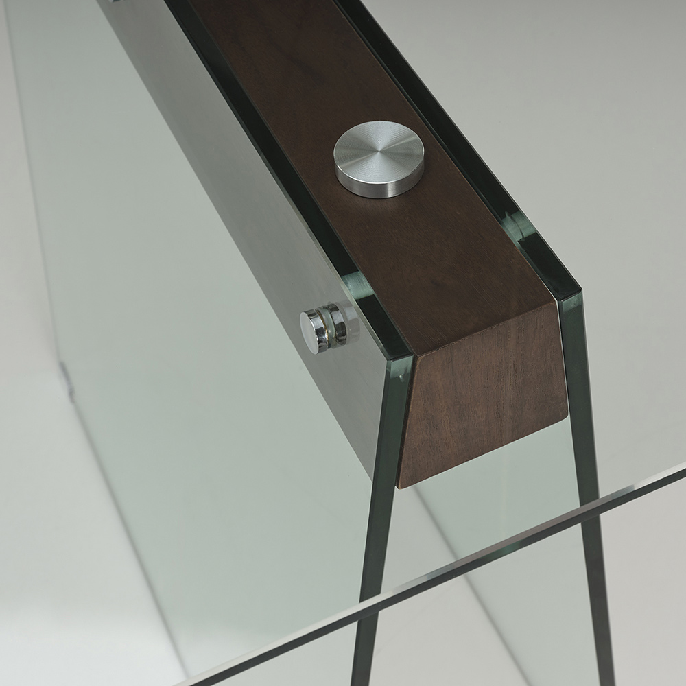 Losanna is een moderne tafel met poten van helder glas en een 12 mm dik helder glazen blad met MDF-inzetstukken in de kleur walnoot.