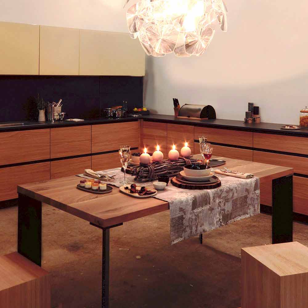 Een tabel met essentiële lijnen die de meest elementaire geometrie interpreteert. Het bijzondere kenmerk zijn de poten diagonaal gepositioneerd, vergeleken met de lijnen van de top. Bepalende combinaties tussen de eenvoud en lichtheid van de vormen en de stevigheid van het materiaal: massieve nationale walnoot en gepoedercoat metaal.