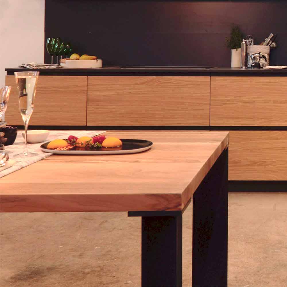 De vaste tafel van Yvonne wordt gekenmerkt door een blad van natuurlijke Italiaanse noten geschilderd met een natuurlijk effect, poten in antraciet, gepoedercoat metaal.