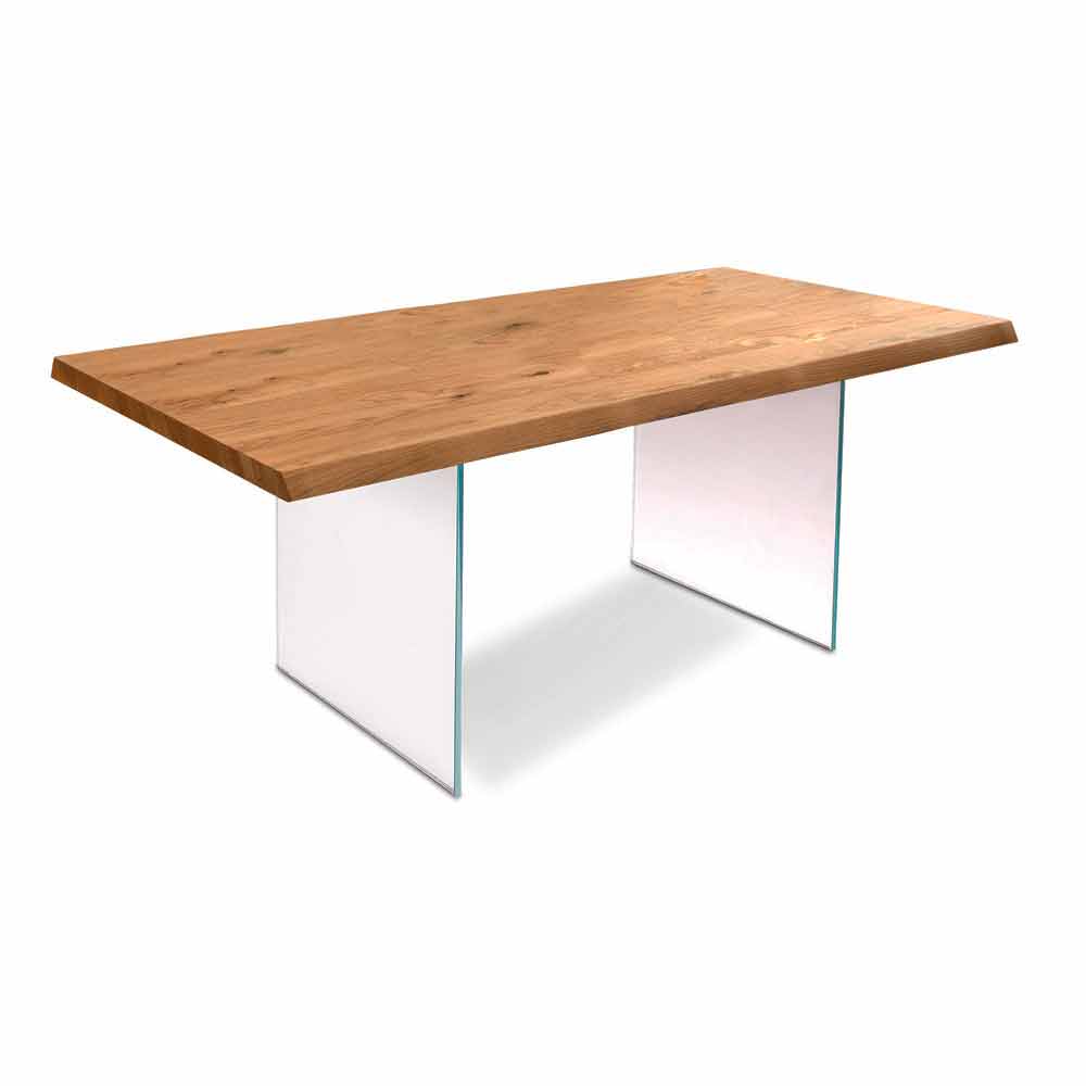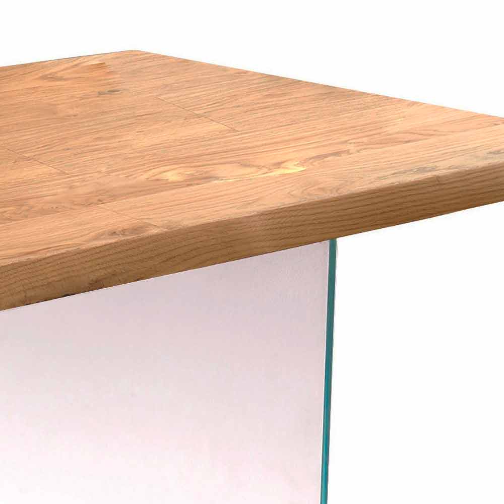 De Nico tafel kenmerkt zich door een ontwerp dat gespeeld wordt op het contrast tussen verschillende materialen zoals hout en glas. Het onderstel is namelijk gemaakt van 12 mm extra helder gehard glas, terwijl het blad in ruw eiken fineer is met massieve en ontschorste rand.