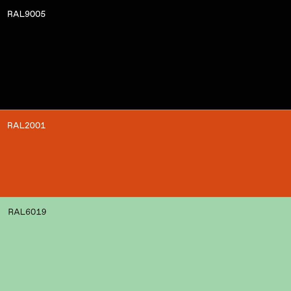Afwerking: poten in oranje RAL2001 + aquagroen kruis RAL6019 + krasbestendig blad in zwart RAL9005
