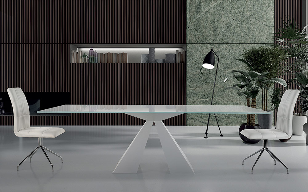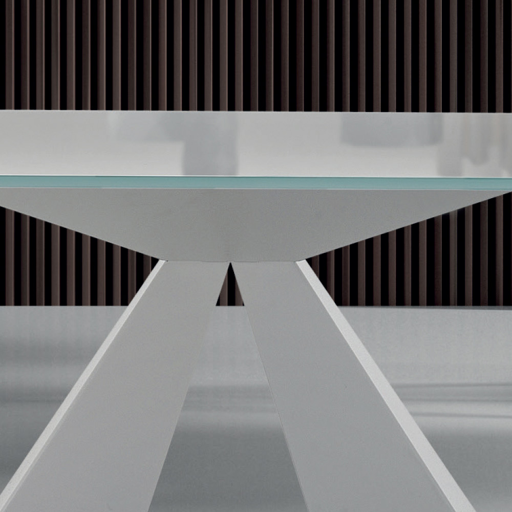 Moderne rechthoekige tafel, handgemaakt in Italië, van gehard glas en een wit stalen onderstel.