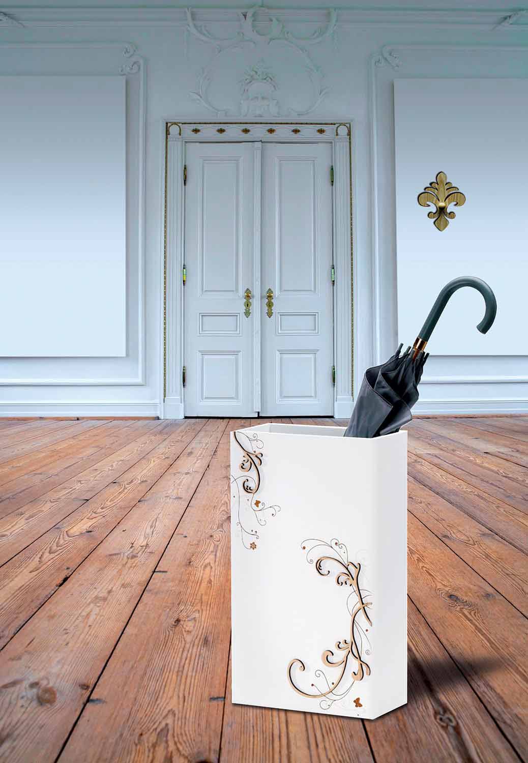 Elegante en moderne rechthoekige paraplubak in hout met lasergesneden motieven, gemaakt in Italiaans vloerontwerp.