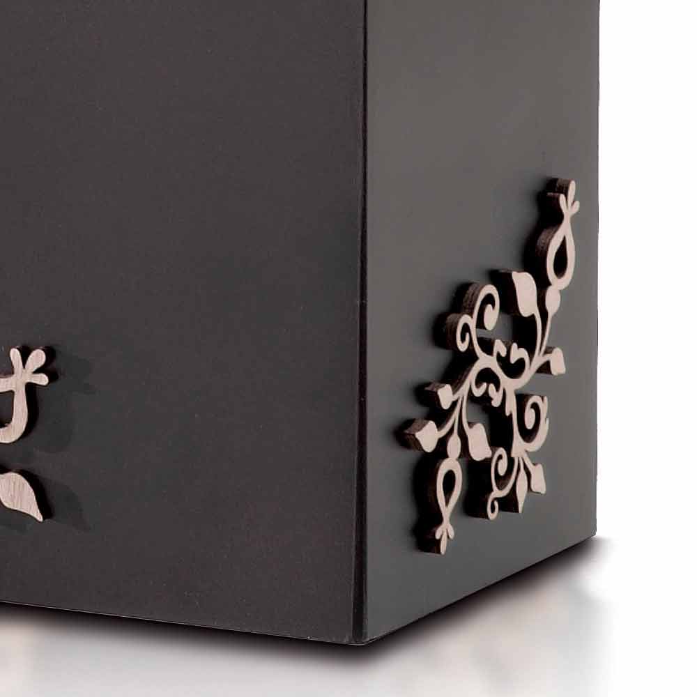 Paraplubak in donker of wit hout met elegante lasergesneden contrasterende decoraties, modern rechthoekig ontwerp en gemaakt in Italië.