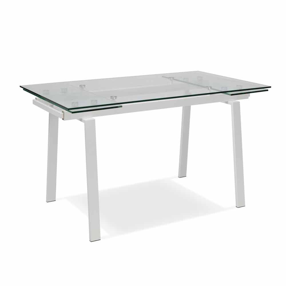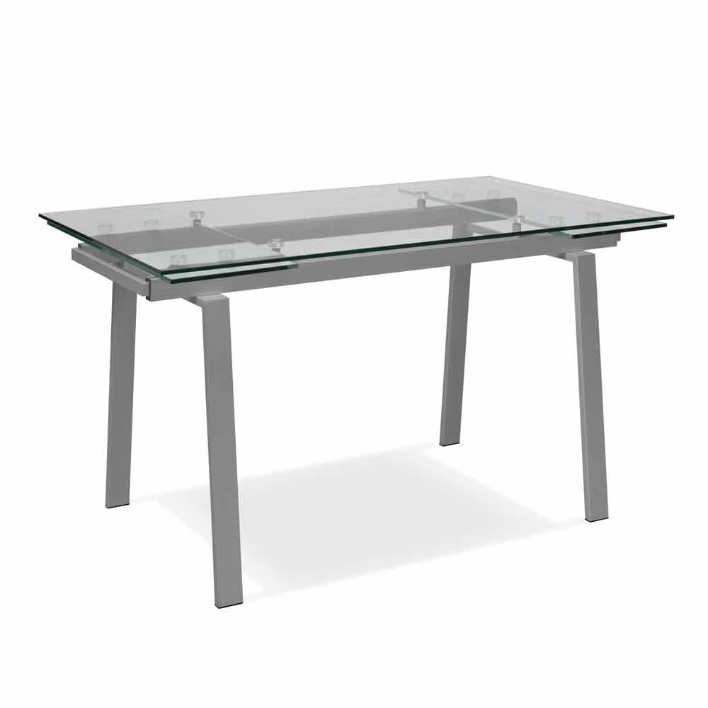 Uitschuifbare designtafel met gelakt metalen onderstel. Bovenblad en verlengstukken van transparant gehard glas.
