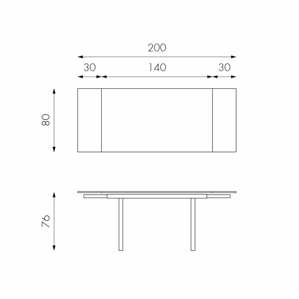 Nardo is een uitschuifbare tafel tot 200 cm met afmetingen: l.140/200 x d.80 x h.76 cm.