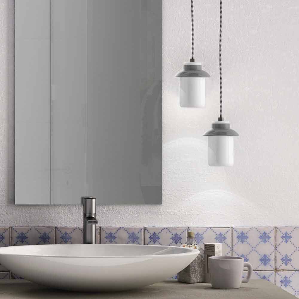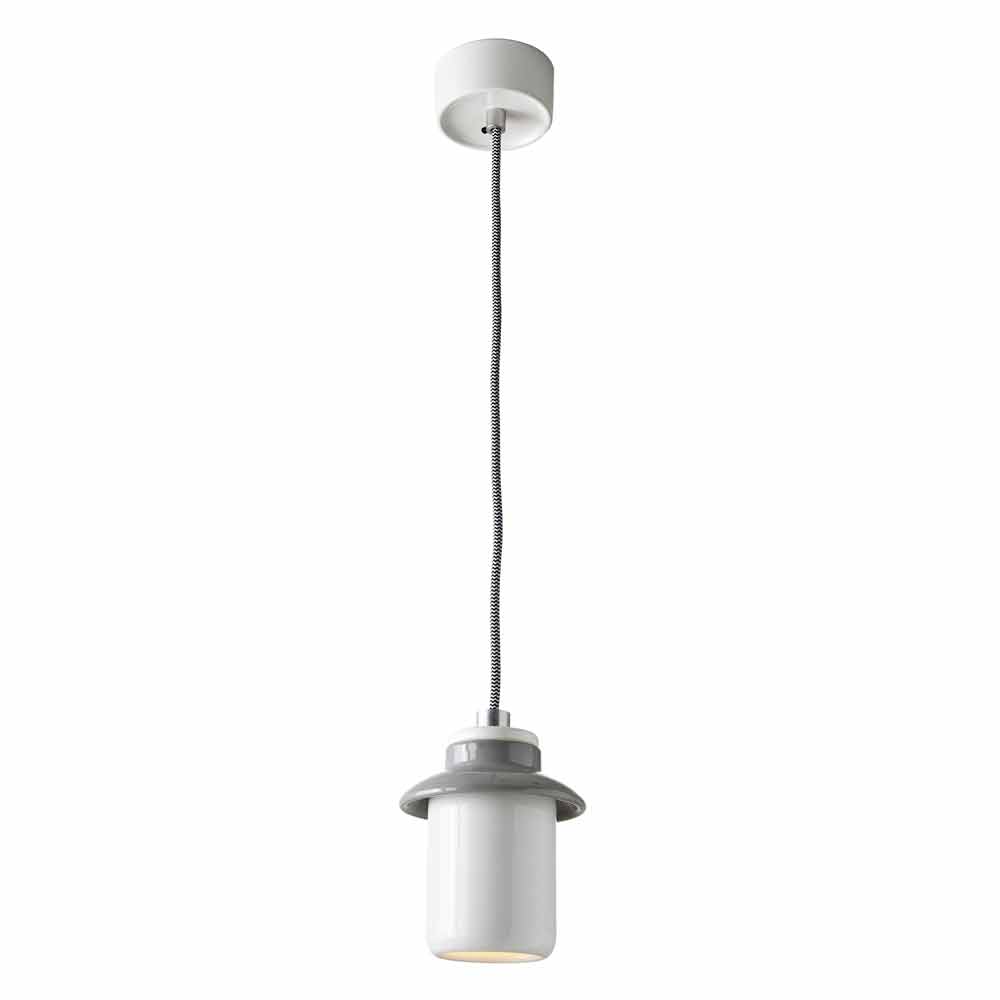 Azië is een fantastische hanglamp van wit en grijs keramiek, met zwarte en witte stoffen kabel en de aluminium kabelklem.