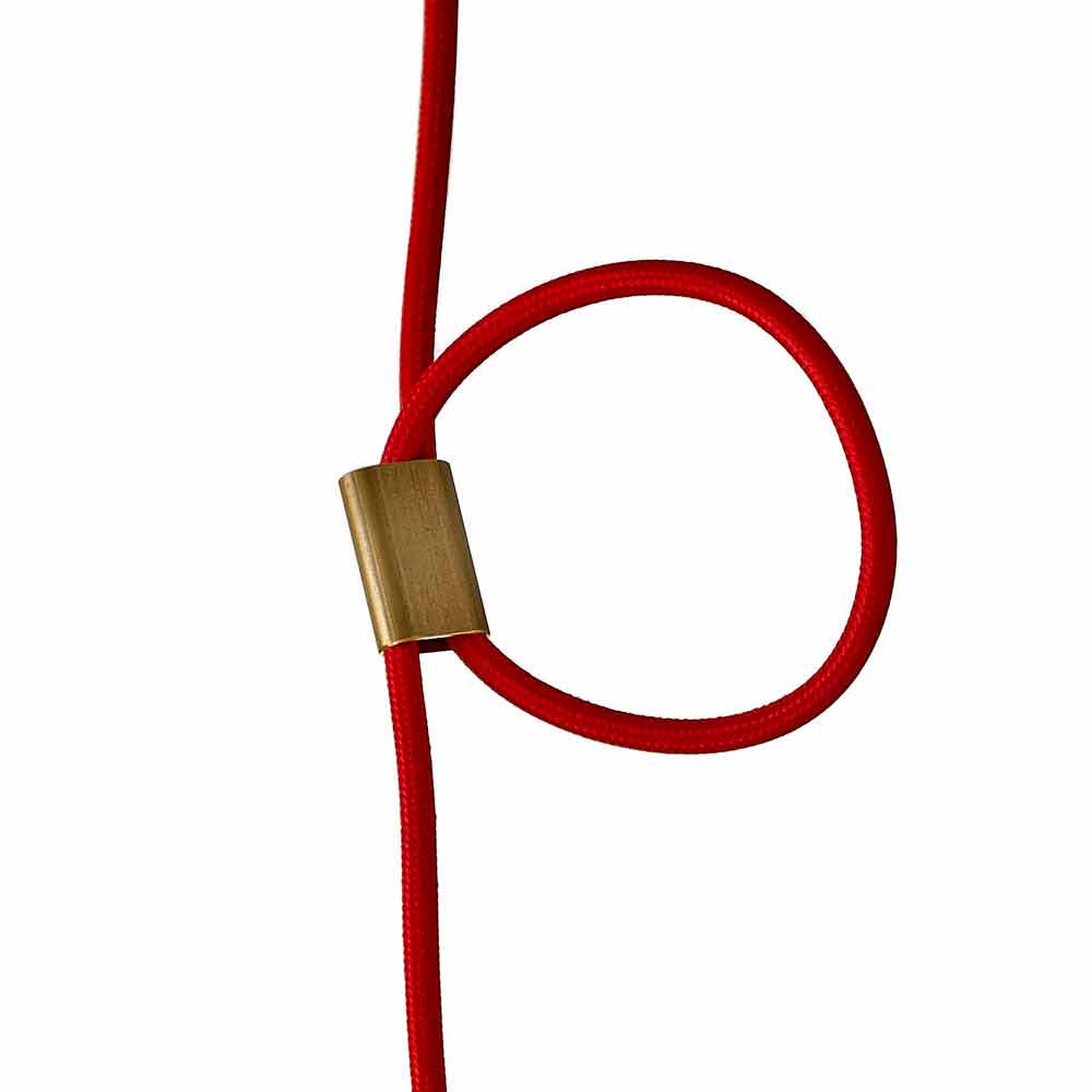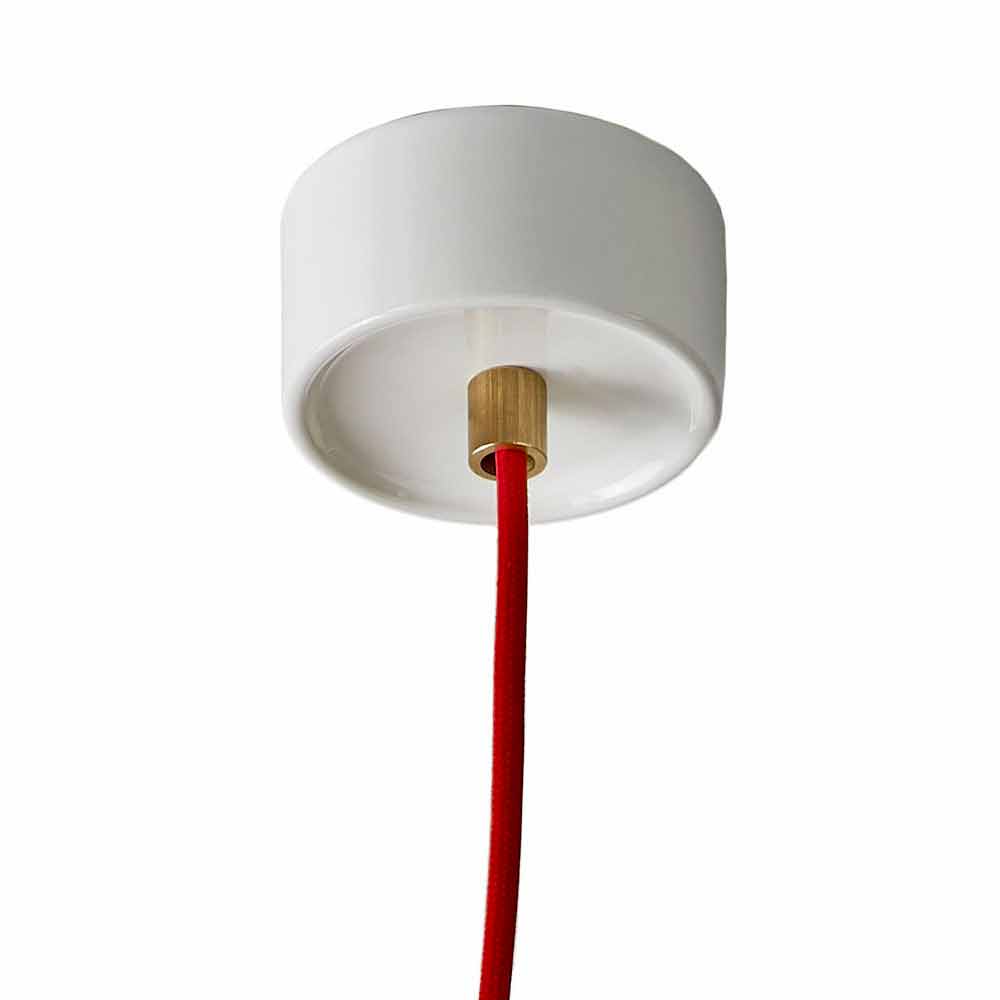 Gekleurde hanglamp in wit keramiek en beukenhout met rode stoffen kabel en messing kabelklem.