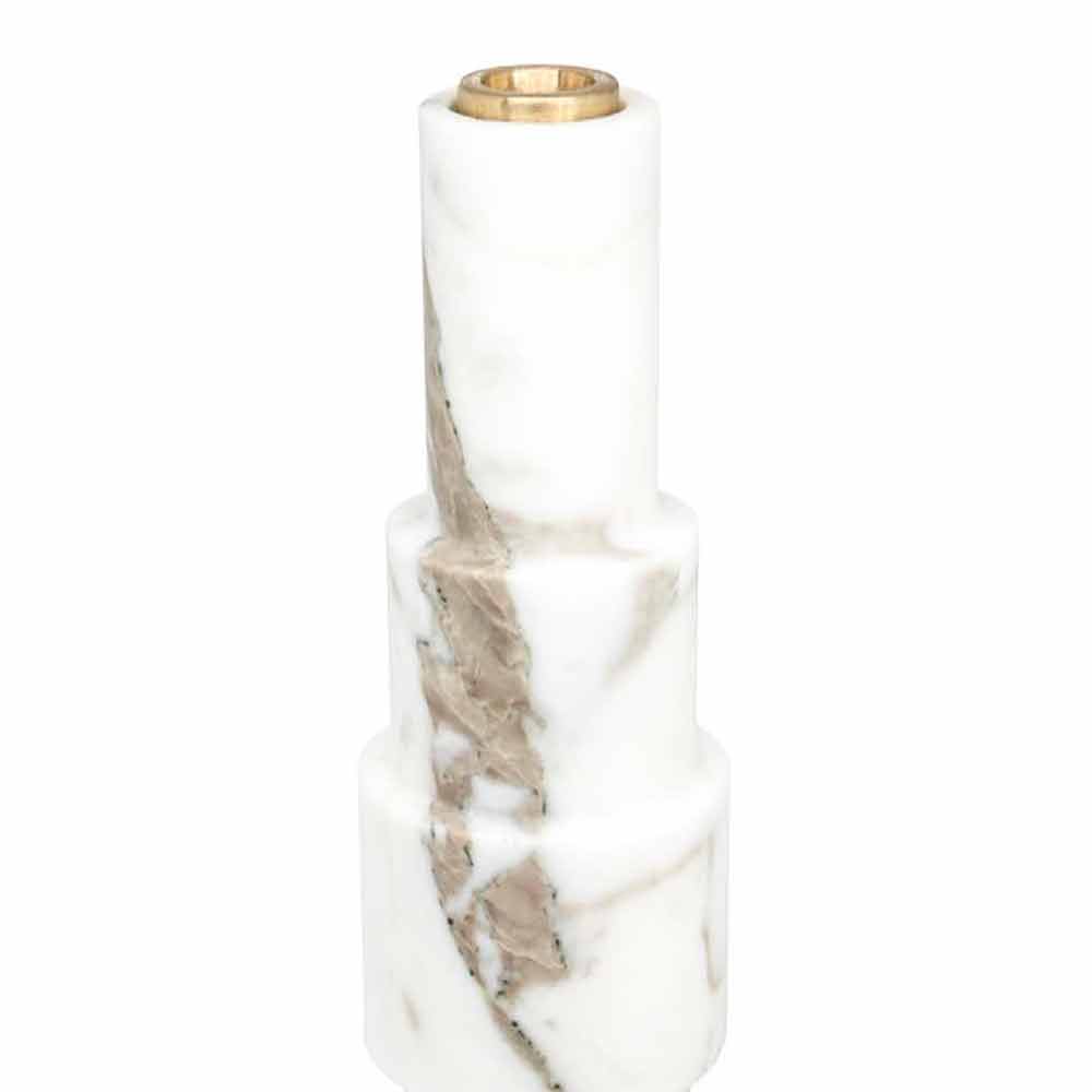 Kandelaar gemaakt van wit Carrara-marmer en messing op zijn eigen unieke manier, omdat elk blok marmer anders is in aders en tinten. Het marmer dat voor de realisatie van het product wordt gebruikt, is afkomstig uit de steengroeve Poggio Silvestre, een bron van eerste kwaliteit wit marmer dat sinds de vorige eeuw is geclassificeerd.