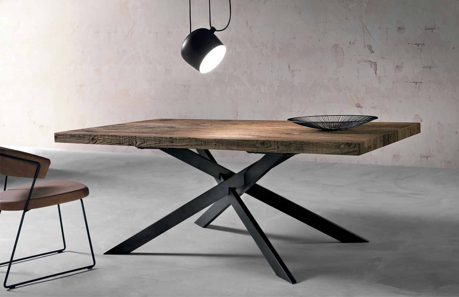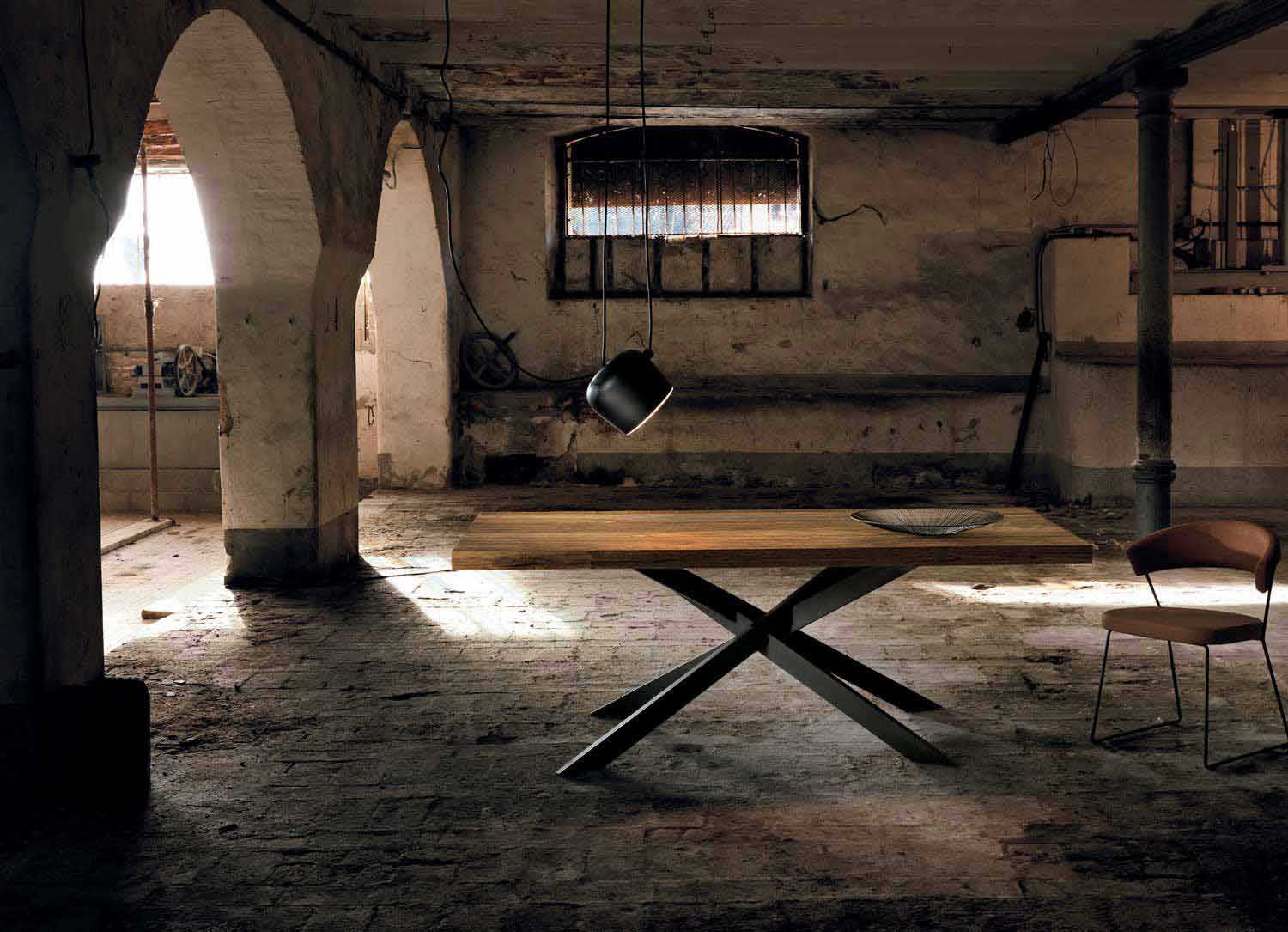 eettafel die wordt gekenmerkt door een modern en robuust design, met eenvoudige en delicate lijnen.